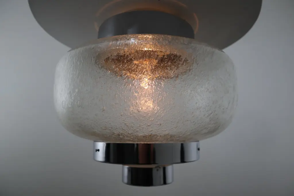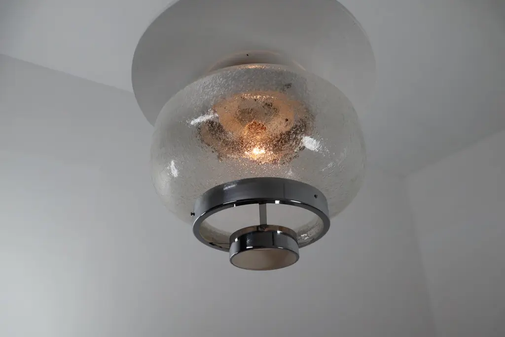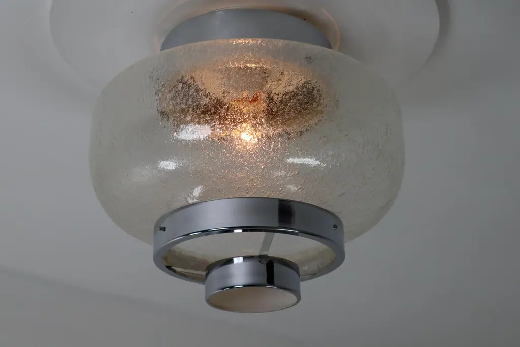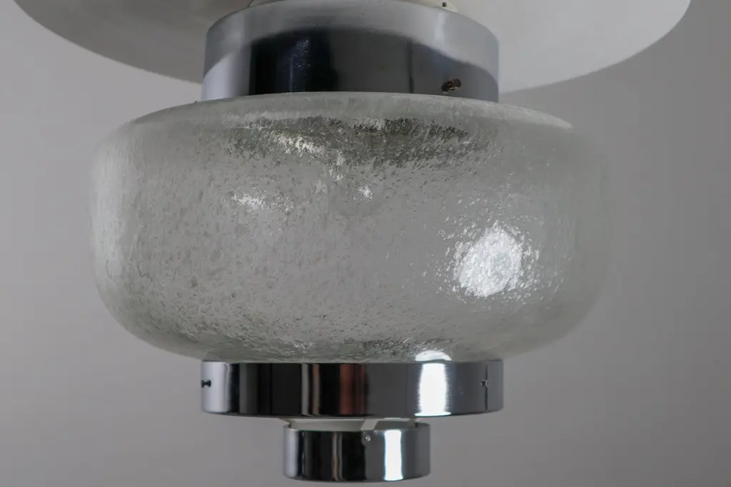 Set of 30 glass flushmount. With controlled bubble glass shade and chrome mounts. The sheets beautifully refracting light. This light will create an absolute stunning light partition by means of its impressive size. The stylish elegance of this lamp suits many environment, from Bauhaus to Mid-Century Modern. The lights are compatible with the US/UK/ etc., standards. Also LED compatible. Cleaned and well-wired, in full working order and ready to use. The frame is in good condition with small patina on metal parts.Size: Diameter 16" x height 15".
