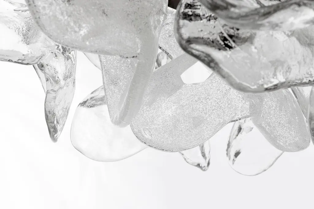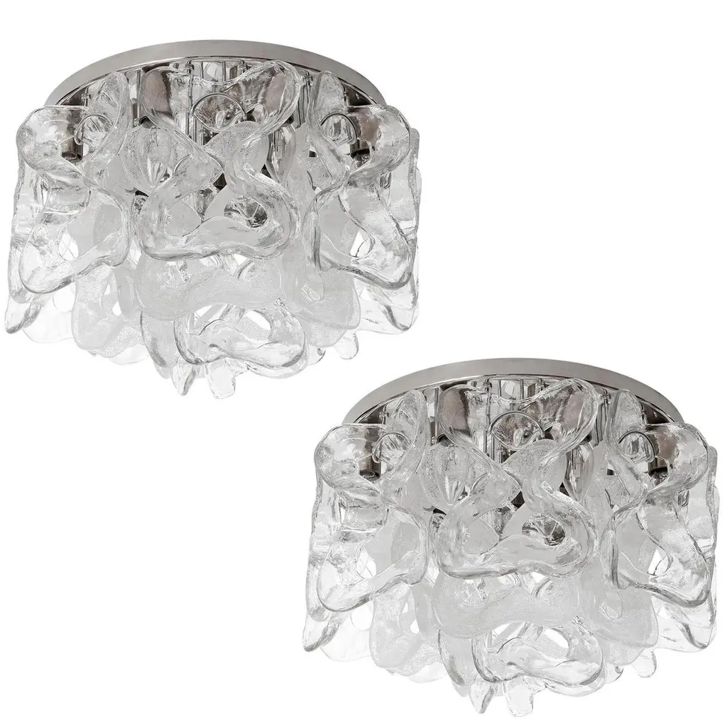A fantastic Mid-Century modern light fixture model 'Catena' by J.T. Kalmar, Austria, manufatured in 1970s.It consists of a polished chrome plate with 18 organic and ribbon-shaped Murano glass pieces. 12 are made of clear crystal glass and 6 white foam bubble glass.A glass piece has the dimensions of ca. 8 x 6 inch (20 x 15 cm).The light has great volume and in reality it looks much bigger than you would expect it from the dimensions.The light is ready to use. It has 13 sockets for small Edison screw base bulbs type E14 up to max. 40 W per bulb. It is possible to install this fixture in all countries (US, UK, Europe, Asia, Canada,) although it may be necessary to purchase different light bulbs (e.g. LED or filament) suitable to local electricity.Two lights are available.