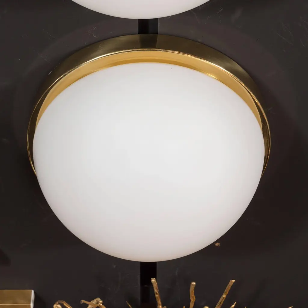 This frosted glass fixture was produced by the esteemed Glashütte Limburg in Germany, circa 1960. It is composed of a domed shape frosted glass with a circular skyscraper style brass base. These fixtures are chic, elegant and timeless, blending seamlessly with virtually any style of interior from quintessentially mid century modernist to contemporary. There are a total of five available. Each includes the original manufacturer's label. Newly rewired to American standards.Germany, circa 1960Dimensions:7" height X 12.75" diameter.