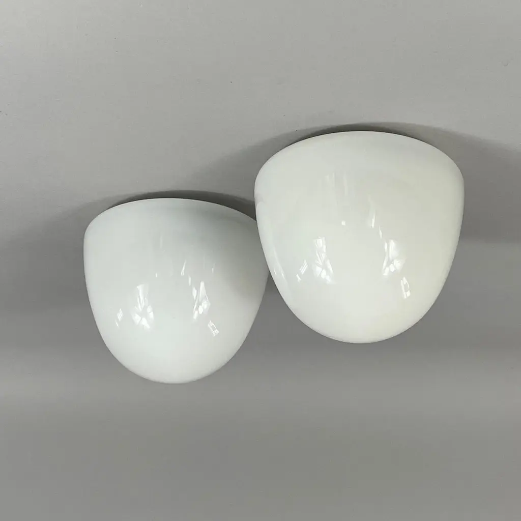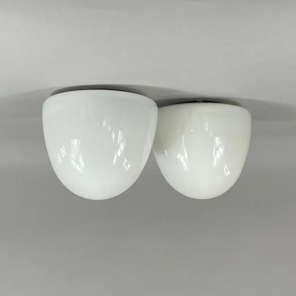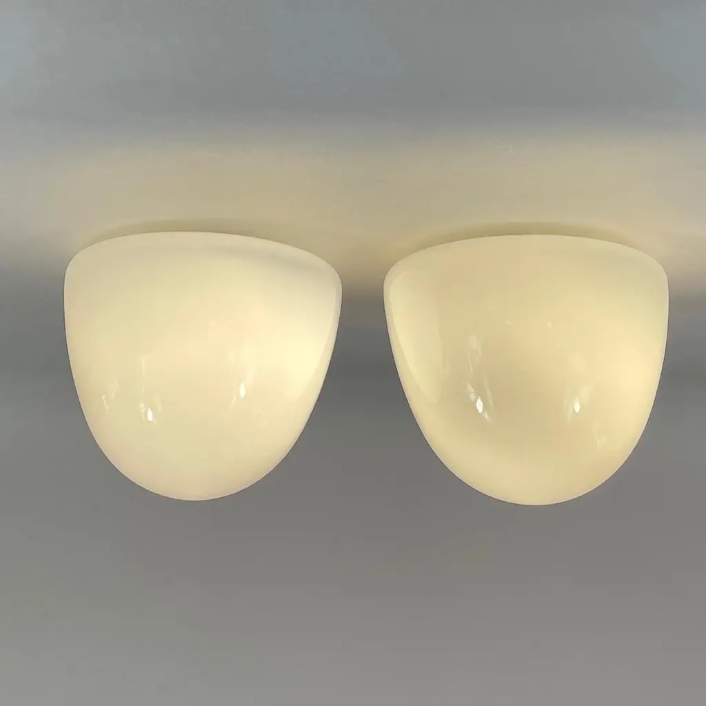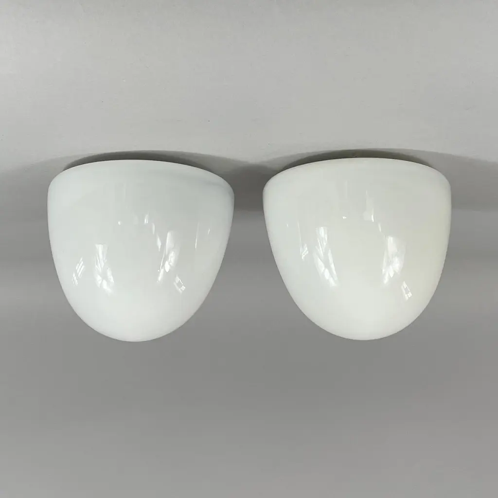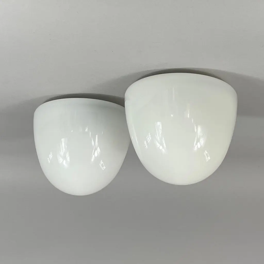 These minimalist flush mounts were designed and manufactured in Germany in the 1930s during the Bauhaus period. The Bauhaus design philosophy emphasized functional, minimalist aesthetics, often using geometric shapes and materials that aligned with mass production methods of the time.The fixtures feature dome-shaped opaque white milk glass shades, which diffuse light softly, creating an elegant and clean look. The mounting made from Bakelite would have been used for its durability and minimalist aesthetic, in line with the Bauhaus movement's focus on functionality.These flush mounts would be typically found in hallways or living spaces, offering a sleek and modern lighting solution that complements Bauhaus design principles: simplicity, functionality, and material honesty. The lights have been rewired and require one E26/E27 bulb each. All lighting is converted for US usage.