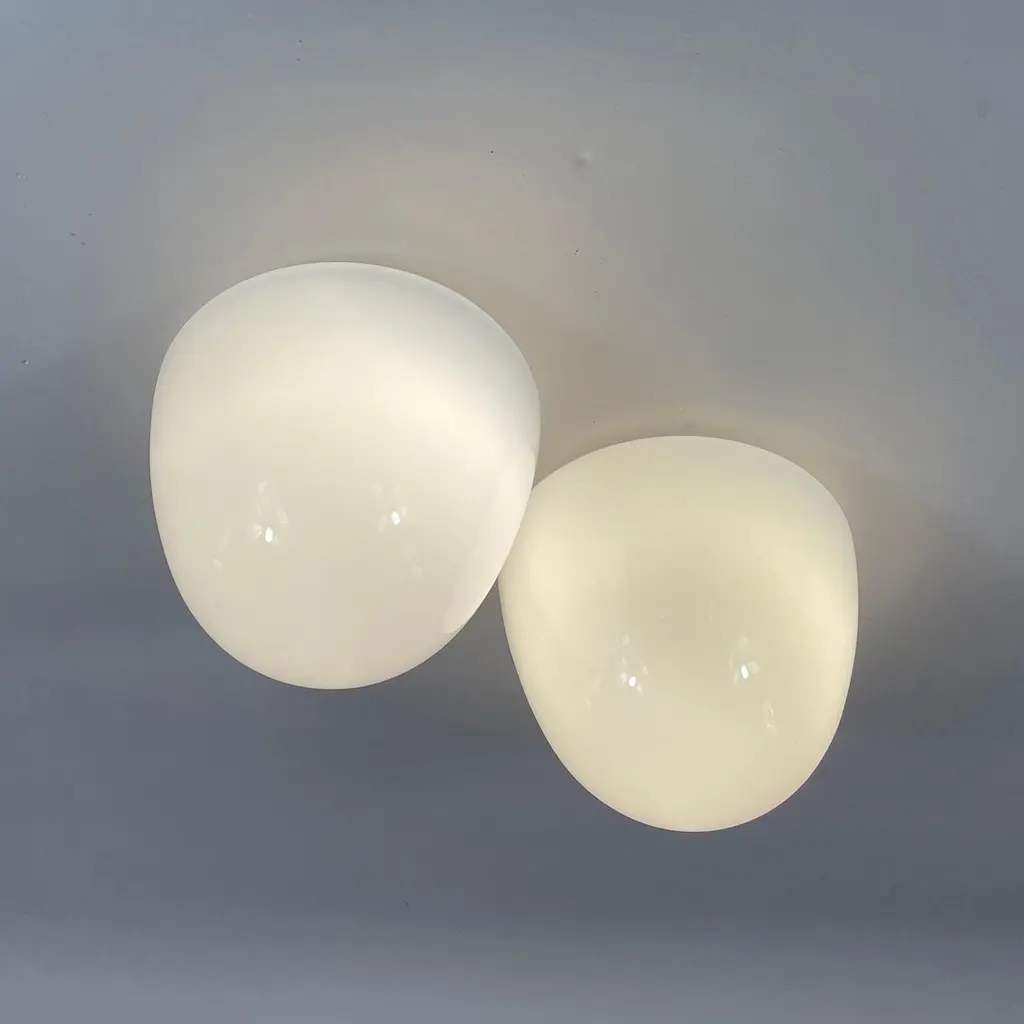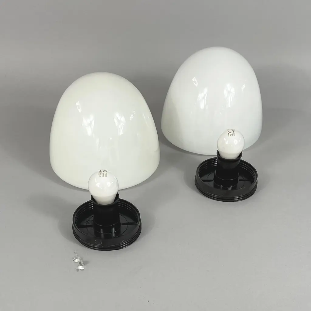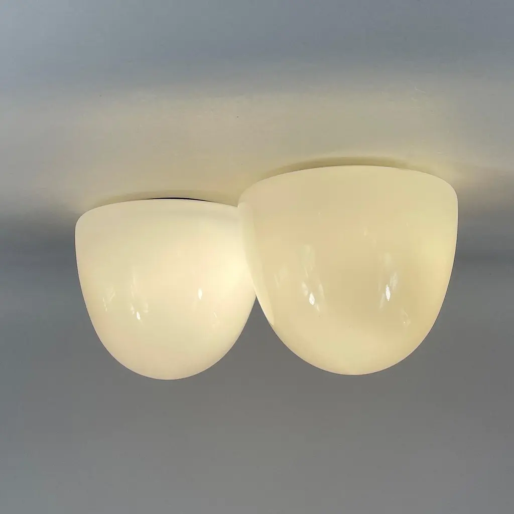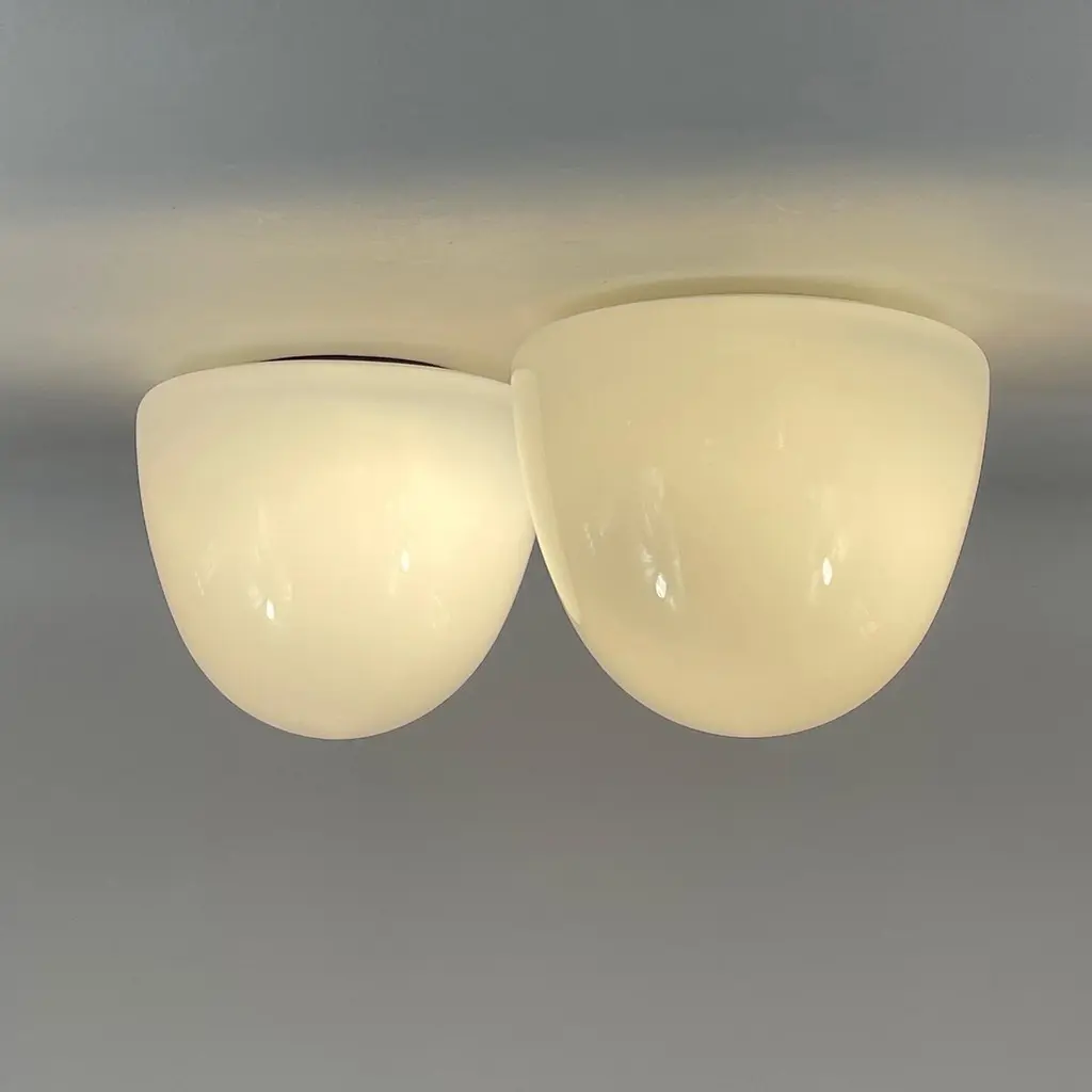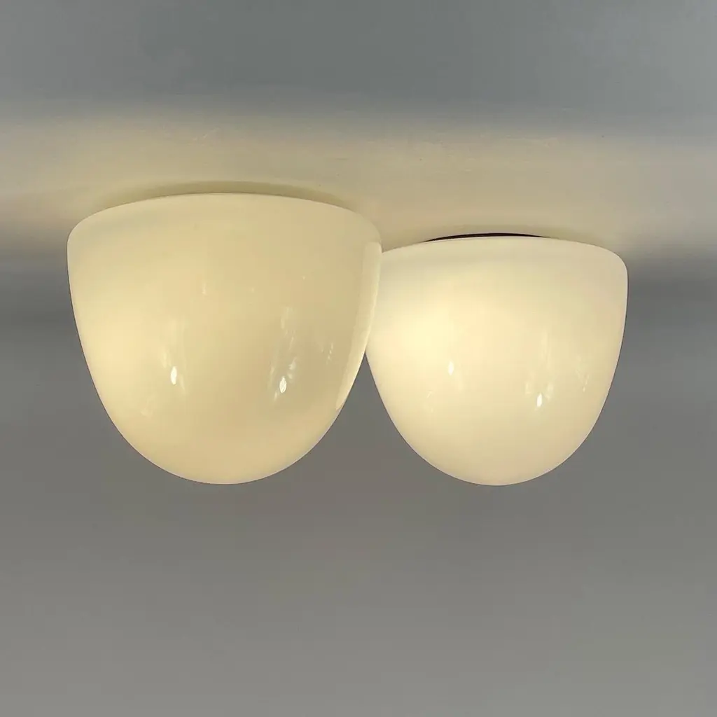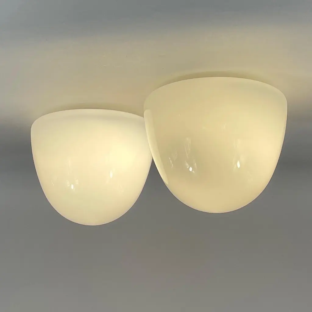 These minimalist flush mounts were designed and manufactured in Germany in the 1930s during the Bauhaus period. The Bauhaus design philosophy emphasized functional, minimalist aesthetics, often using geometric shapes and materials that aligned with mass production methods of the time.The fixtures feature dome-shaped opaque white milk glass shades, which diffuse light softly, creating an elegant and clean look. The mounting made from Bakelite would have been used for its durability and minimalist aesthetic, in line with the Bauhaus movement's focus on functionality.These flush mounts would be typically found in hallways or living spaces, offering a sleek and modern lighting solution that complements Bauhaus design principles: simplicity, functionality, and material honesty. The lights have been rewired and require one E26/E27 bulb each. All lighting is converted for US usage.