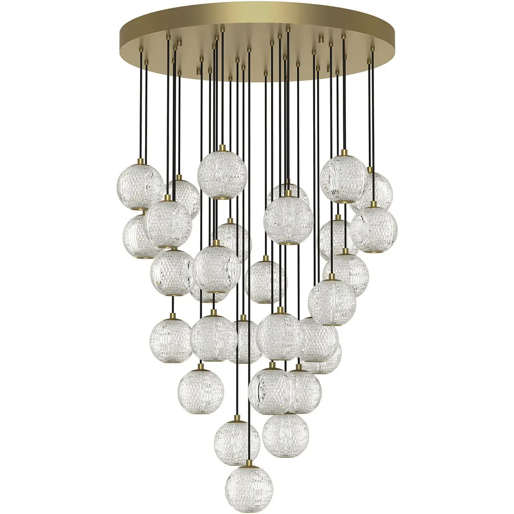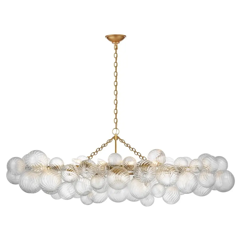 Swirl-ribbed or plated champagne glass globes dangle from an Aged Brass frame, creating this cloud-like showstopper. Whether you’re dressing up a breakfast nook with the small chandelier, adding a soft glow to an entryway with the flush mount, or making a glam statement in your dining room with the large chandelier, the possibilities for Mimi are endless. Part of our Megan Molten x Mitzi Tastemakers collection.