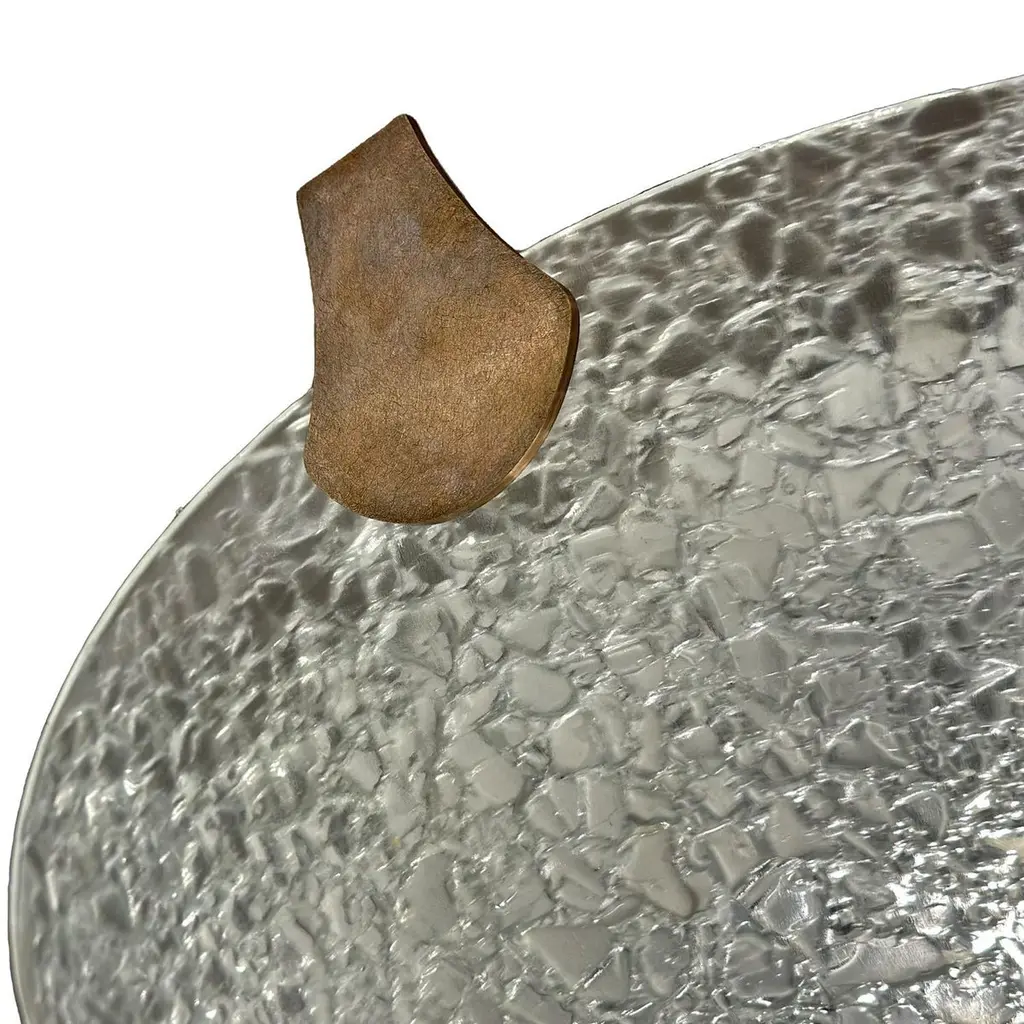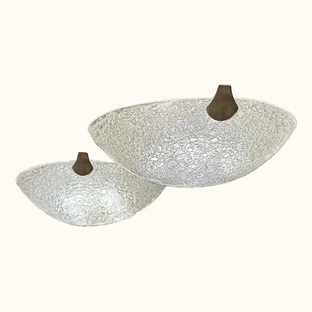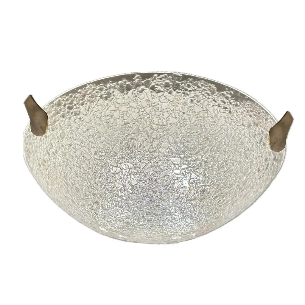 Sleek and modern, the minimalist design of these flush mount ceiling fixtures makes them suitable for contemporary interior space. A smoooth outside surface is given visual texture by the addition of fritted glass that coats the convex side of the fixture. The fixtures are suspended by simple supports that compliment their contemporary aesthetic. Sold as a pair or separately and priced individually.