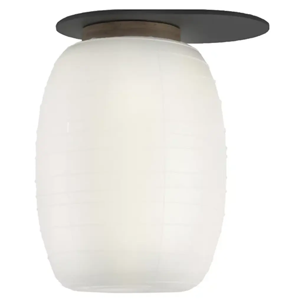 A soothing display of traditional crafted arts. The Misko C35 Flushmount from B.lux is an homage to traditional Japanese lantern-making, imagined with sculptural blown glass. The shapes and accents of the Japanese lantern represent for Stone Designs a beautiful simplicity and naturalness. Here, washi paper is substituted for blown opaque glass, and a traditional bamboo framework is illustrated with a raised linear pattern. A low-profile metal canopy gives the clean glass a visual boost with a contrasting hue. This canopy receives a warm glaze of light as the golden shade generates a cozy aura.