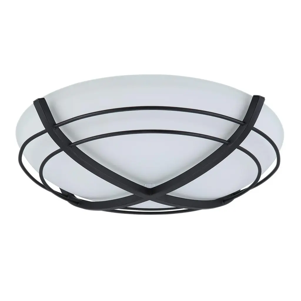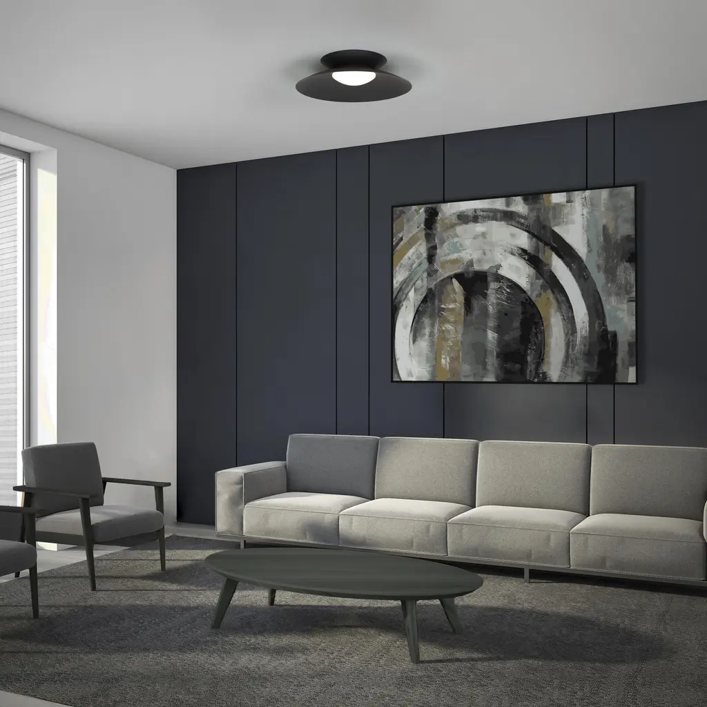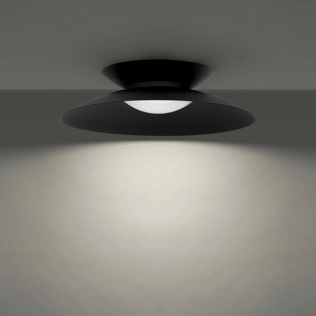 Go bold with a dramatic ceiling luminaire that is ideal for minimalist spaces. A black shade curves around a white diffuser, creating downward-directed illumination.