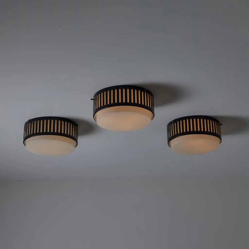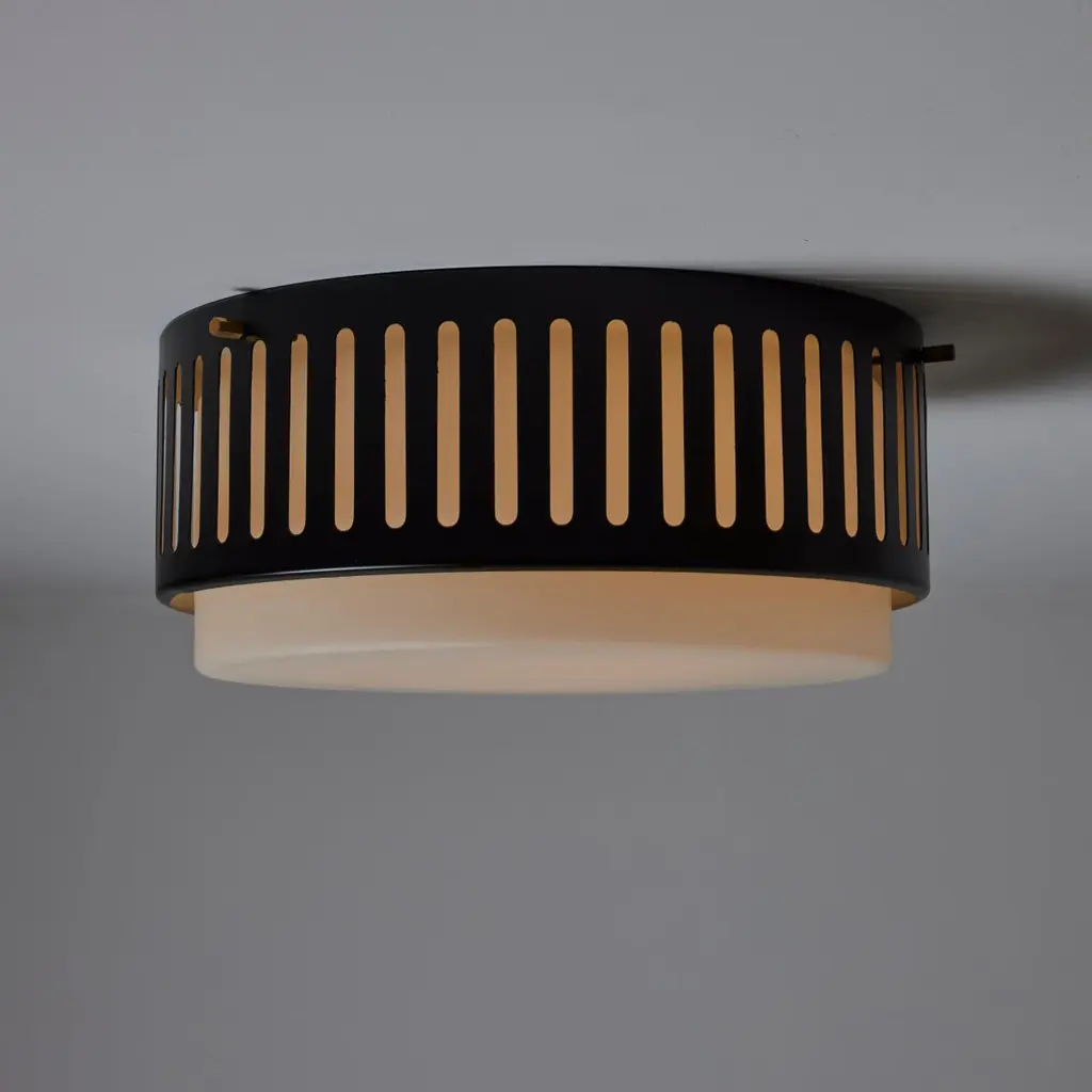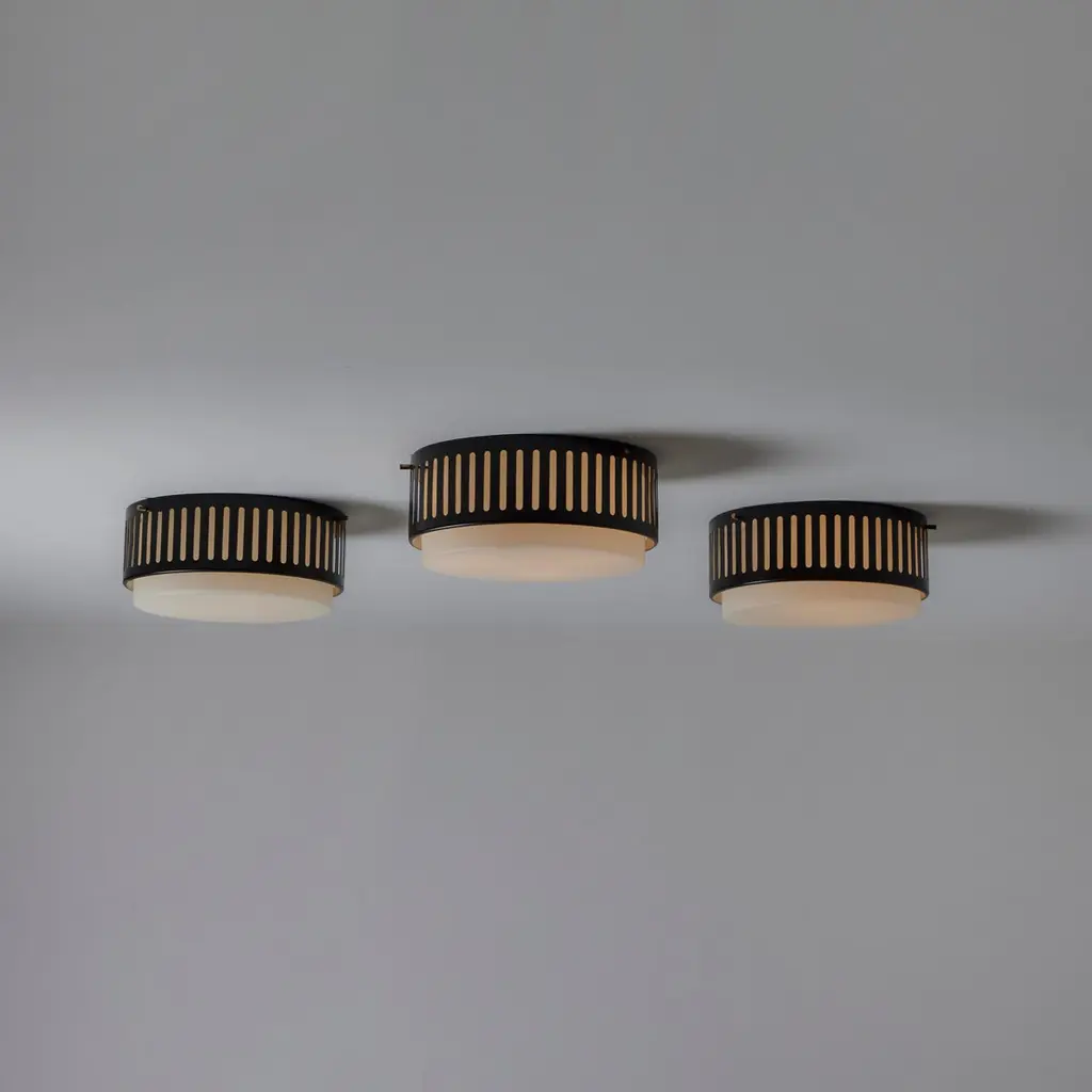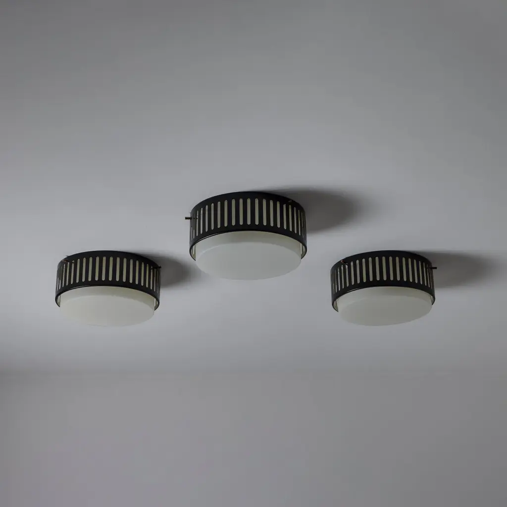 Model 1206 flush mounts by Stilnovo. Designed and manufactured in Italy, circa the 1960s. Beautiful enameled classic flush mounts by Stilnovo. Perforated lines encompass the exterior aluminum cage. The exterior cage is black, there is a photo included at the end of the listed images to refer to the specific hue. A sandblasted opal white glass diffuser sits within. The fixtures use a dual E27 socket type, adapted for the US. Rewired for the US. We recommend using 40w max bulbs on this application. Bulbs not provided. Sold individually.