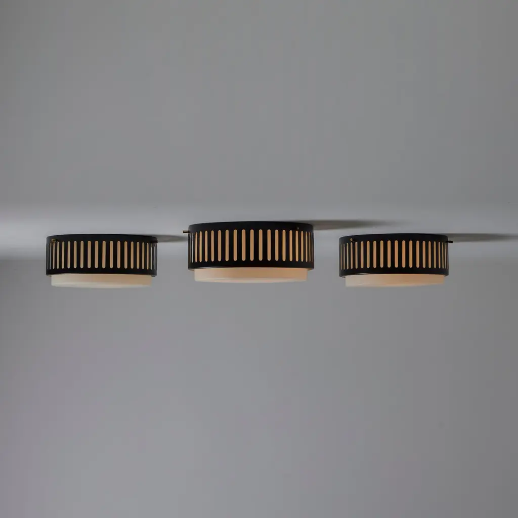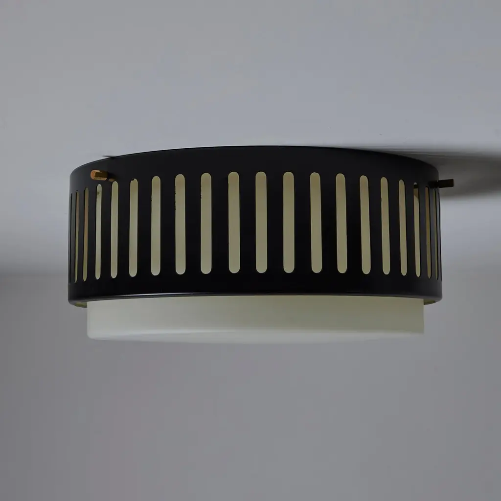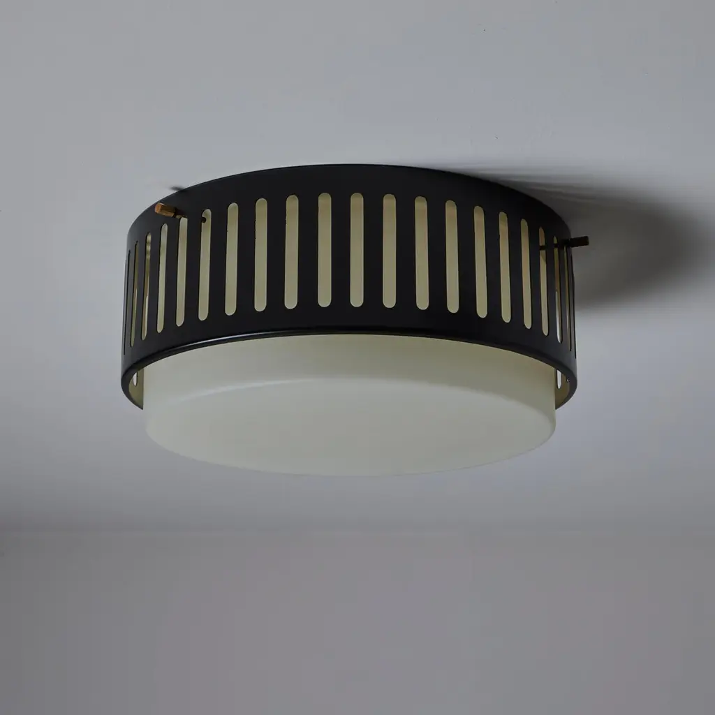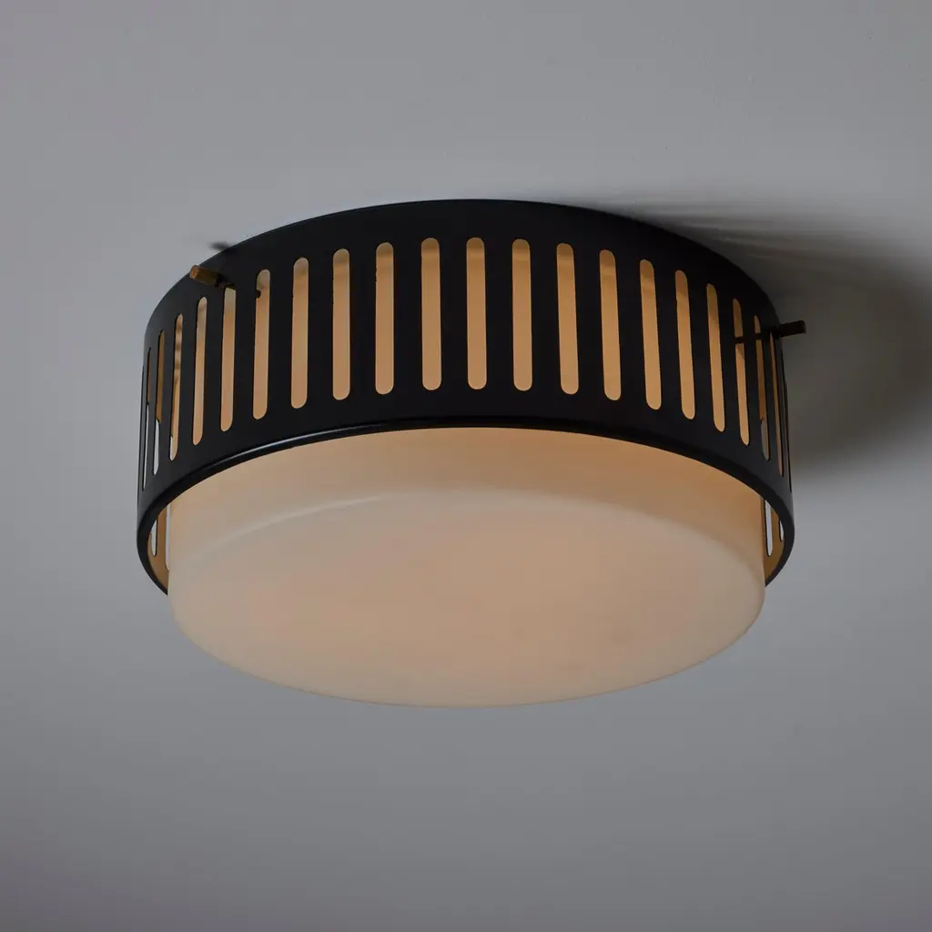 Model 1206 flush mounts by Stilnovo. Designed and manufactured in Italy, circa the 1960s. Beautiful enameled classic flush mounts by Stilnovo. Perforated lines encompass the exterior aluminum cage. The exterior cage is black, there is a photo included at the end of the listed images to refer to the specific hue. A sandblasted opal white glass diffuser sits within. The fixtures use a dual E27 socket type, adapted for the US. Rewired for the US. We recommend using 40w max bulbs on this application. Bulbs not provided. Sold individually.