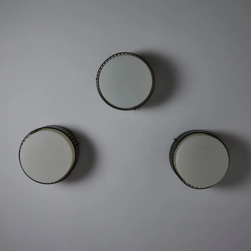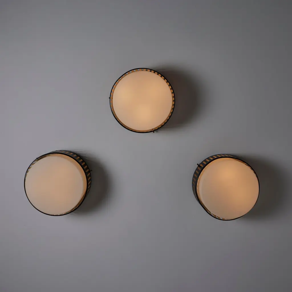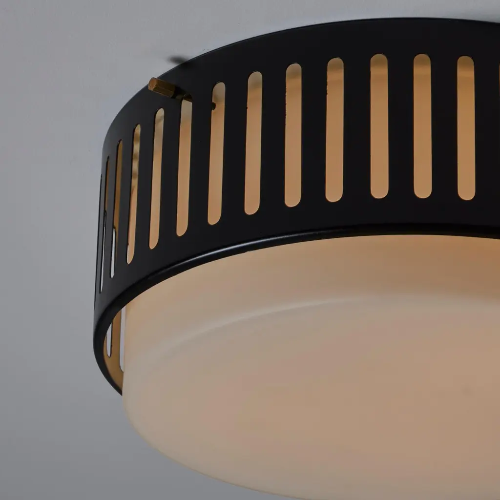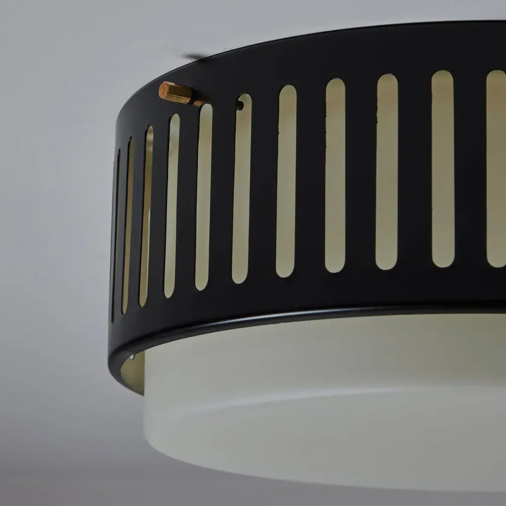 Model 1206 flush mounts by Stilnovo. Designed and manufactured in Italy, circa the 1960s. Beautiful enameled classic flush mounts by Stilnovo. Perforated lines encompass the exterior aluminum cage. The exterior cage is black, there is a photo included at the end of the listed images to refer to the specific hue. A sandblasted opal white glass diffuser sits within. The fixtures use a dual E27 socket type, adapted for the US. Rewired for the US. We recommend using 40w max bulbs on this application. Bulbs not provided. Sold individually.