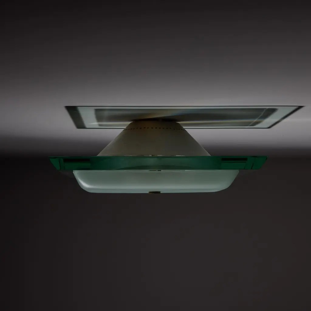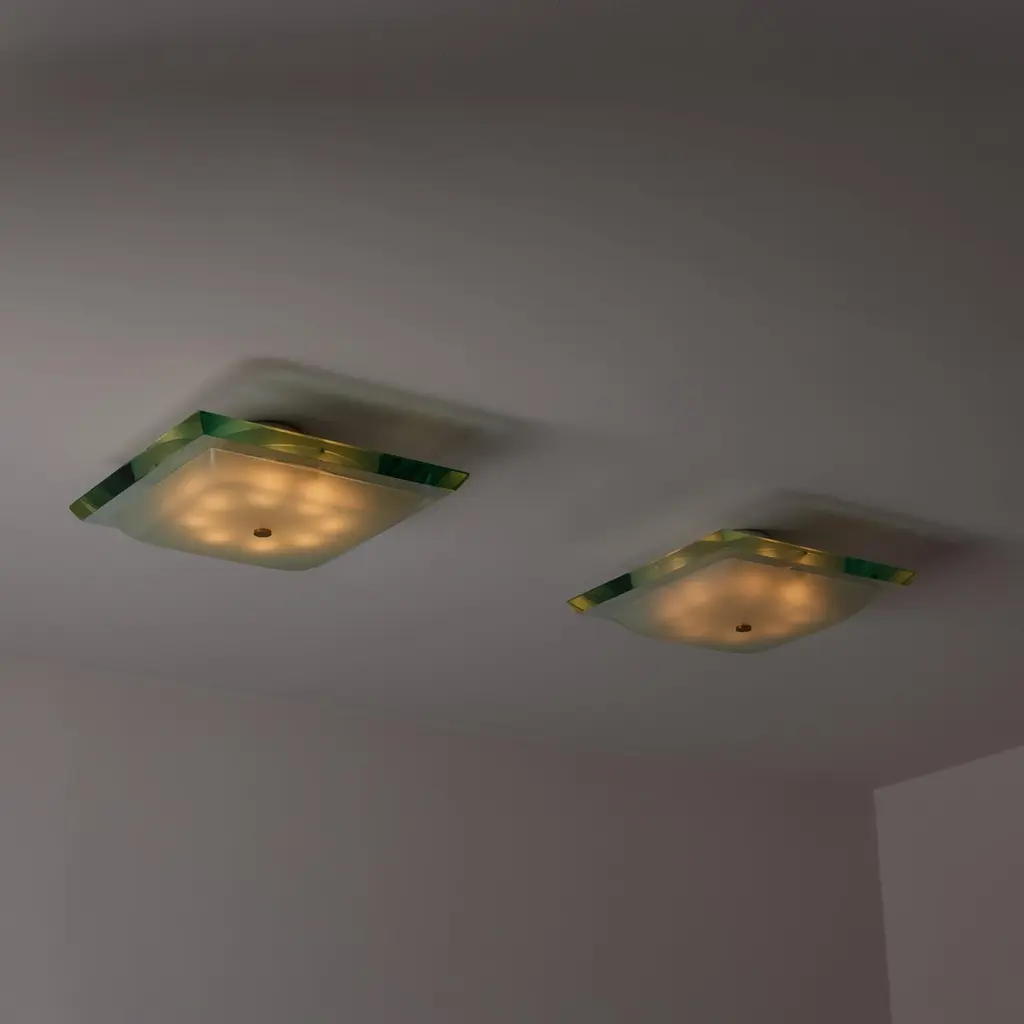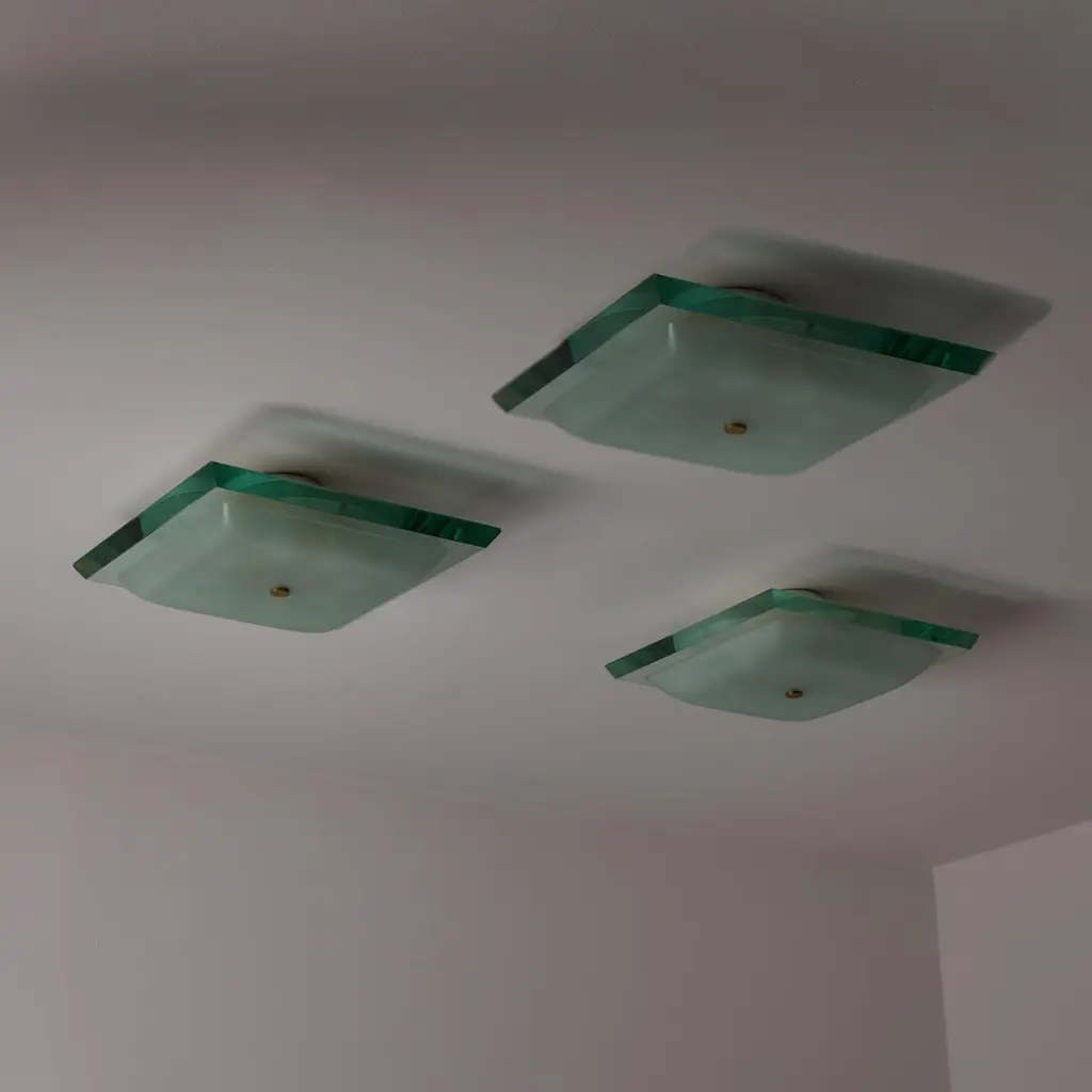 Two Mod. 1990 flush mount by Max Ingrand for Fontana Arte. Designed and manufactured in Italy circa the 1960s. Iconic and recognized teal blue thick cut and beveled cut glass from Fontana Arte makes this simple, striking ceiling light. A bottom frosted diffuser allows for muted illumination. This light holds 8 e14 sockets, adapted for the US. We recommend 8 20w max bulbs. Bulbs are not included. Sold individually, QTY: 2 available through images indicate three.