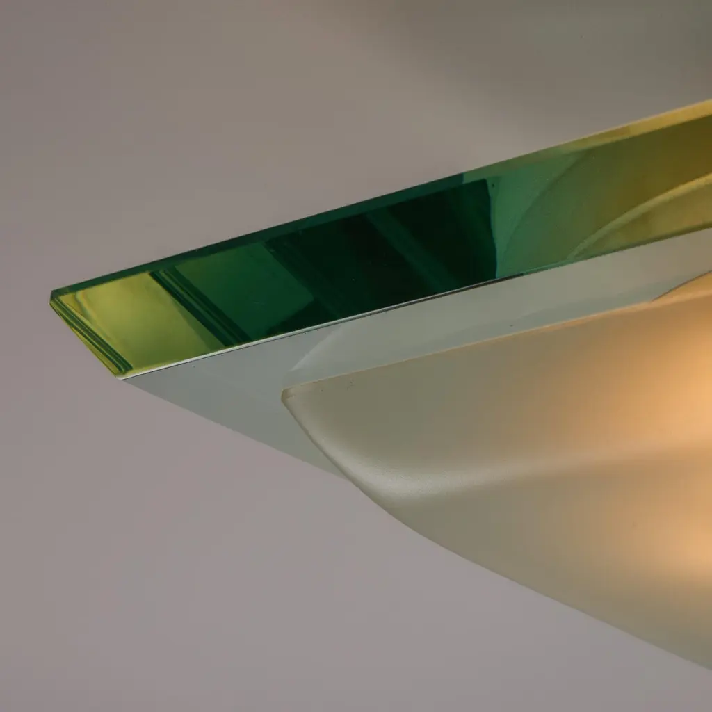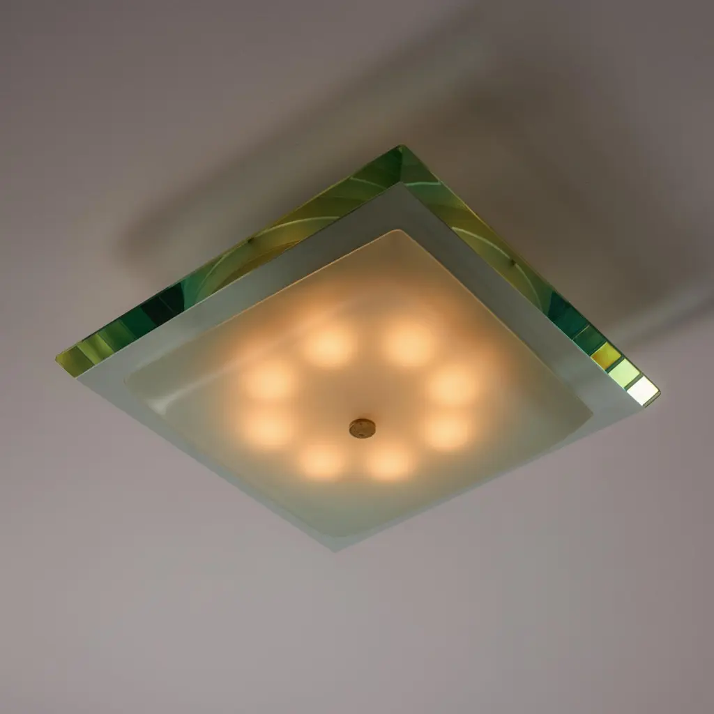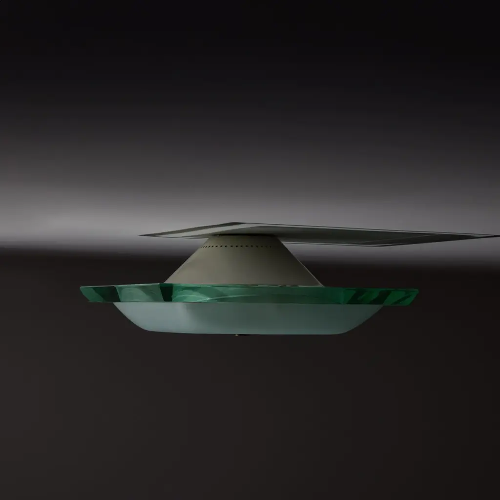 Two Mod. 1990 flush mount by Max Ingrand for Fontana Arte. Designed and manufactured in Italy circa the 1960s. Iconic and recognized teal blue thick cut and beveled cut glass from Fontana Arte makes this simple, striking ceiling light. A bottom frosted diffuser allows for muted illumination. This light holds 8 e14 sockets, adapted for the US. We recommend 8 20w max bulbs. Bulbs are not included. Sold individually, QTY: 2 available through images indicate three.