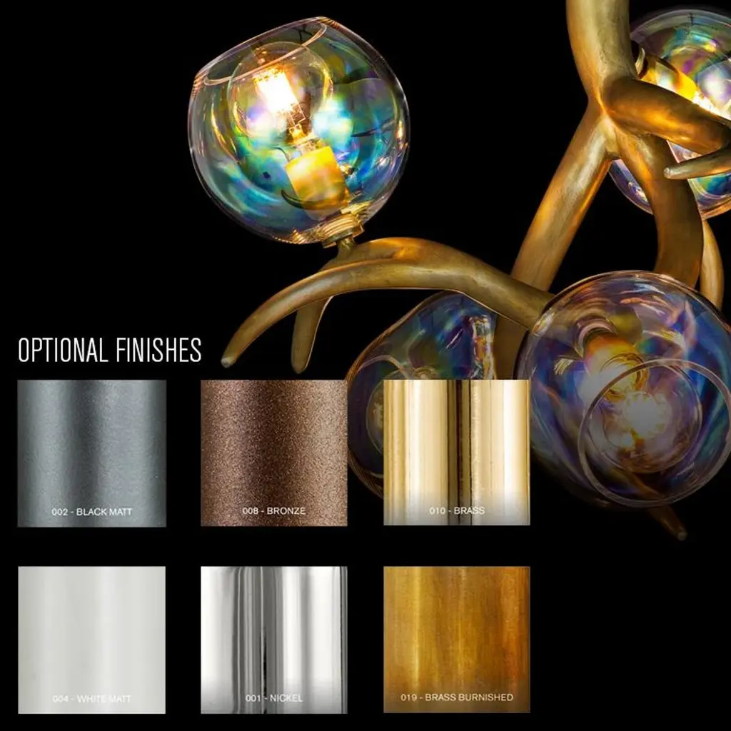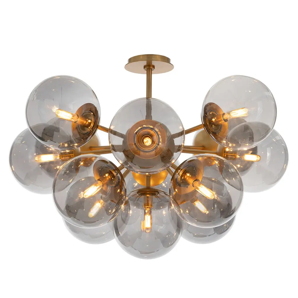 With a low ceiling, your space can be illuminated by this Ersa ceiling chandelier in a brass burnished finish with bronze glass spheres, also available in different finishes and colored glass.Ersa, named after the ancient Greek goddess of morning dew, draws inspiration from that most magical moment of the day: the sunrise. Early morning, when the first light of day sends the darkness of the night away, we can see one of nature’s wonders on display: dew drops formed throughout the night. Just as the change of temperature on a surface creates dew, also new finishes and materials are born under shifting conditions. The iridescence on our glass, leading to the gradual change of color as the angle of view or illumination changes, radiates a stunning glow.The Ersa collection is available in chandeliers, pendants, flush mounts, floor lamps, and wall lights and sconces.The Ersa collection offers several finishes for you to discover: black matt, white matt, bronze, nickel, brass and brass burnished. Standard the Ersa will be delivered with iridescent glass spheres. Other options are bronze translucent and clear glass spheres.Upon receiving your confirmation, our atelier will start with the creation by hand of your ordered lighting sculpture. After your confirmation, we can no longer change the specifications of your order.
