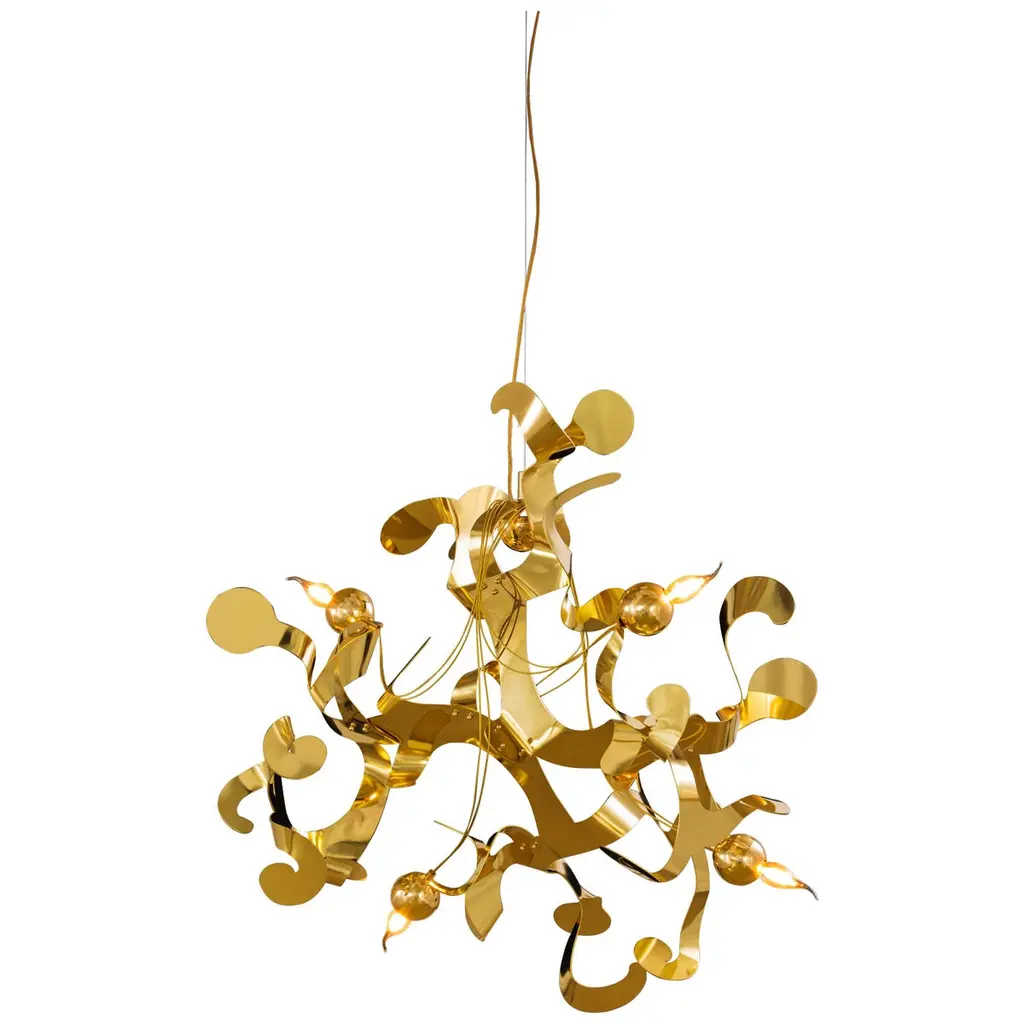 Designed by William Brand, this Kelp modern chandelier in an oval shape and in a copper finish is bent by skilled craftsmen in graceful curls and shapes in the atelier of Brand van Egmond. The playful and organic form of the Kelp offers endless possibilities in creating different sculptural volumes and shapes. The Kelp modern chandelier can be ordered in a round, oval, and conical chandelier. Each model offers different dimensions. Frivolous and light-hearted, spirited and energetic; the arched and curved Kelp dances through the air. The light sparkles warmly as in a crackling open fire, bringing an exhilarating sense to any space. As nature comes in many forms, the Kelp can be ordered in different shapes and sizes. The possibilities are endless. The Kelp is available in three modern chandeliers, pendants, and flushmounts. Use the Kelp Pendants in any variety you like, as a single object or a dancing composition by entwining various objects together.The finishes are in black matt, stainless steel, brass, brass aged, brass grinded, brass burnished, and copper. There is the additional option possibility to order the finish of the light globes different from the rest of the Kelp, allowing for a cheerful and personal finishing touch.Upon receiving your confirmation, our atelier will start with the creation by hand of your ordered lighting sculpture. After your confirmation, we can no longer change the specifications of your order.