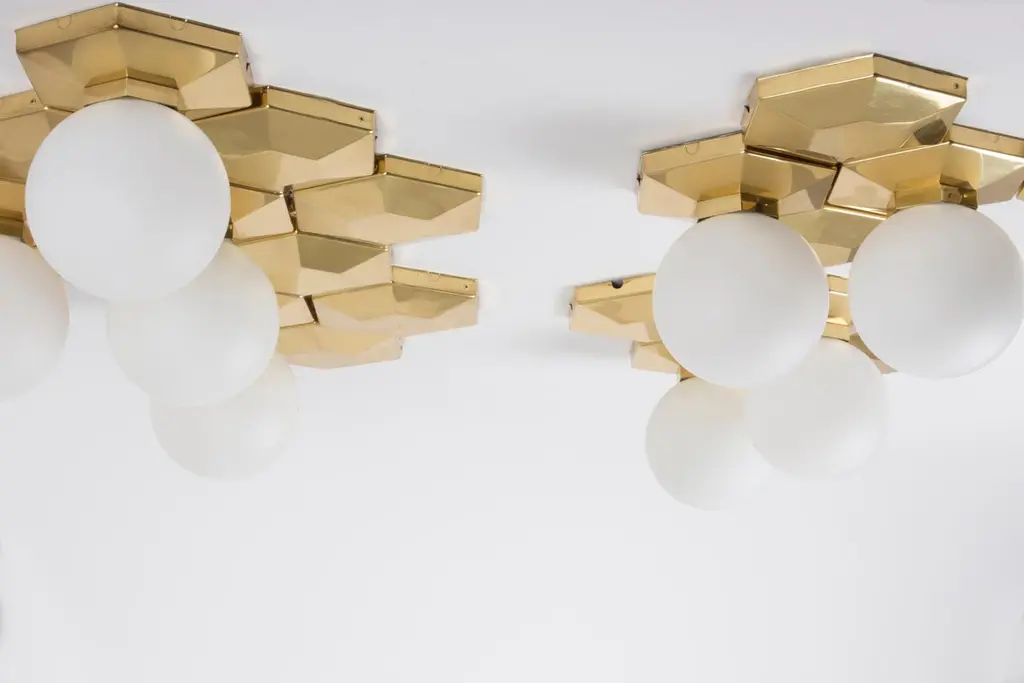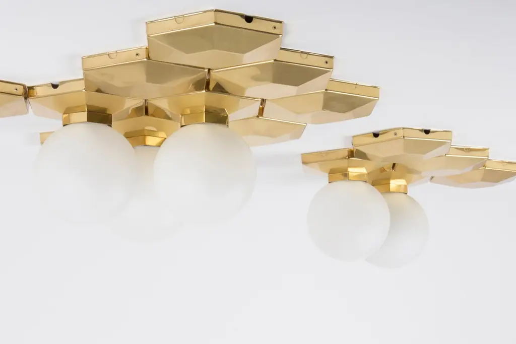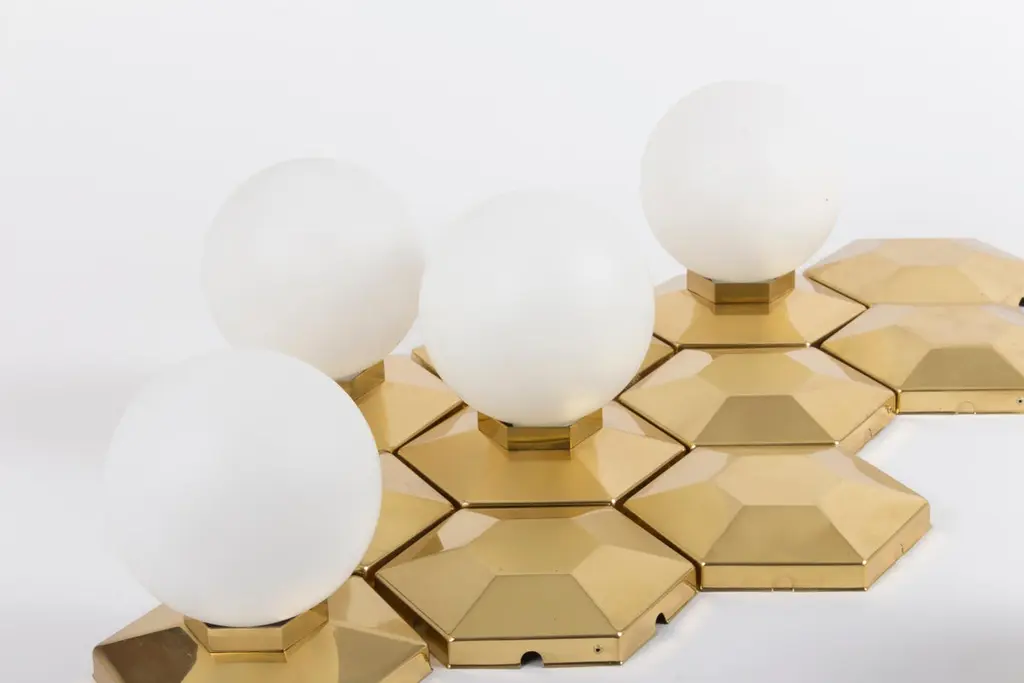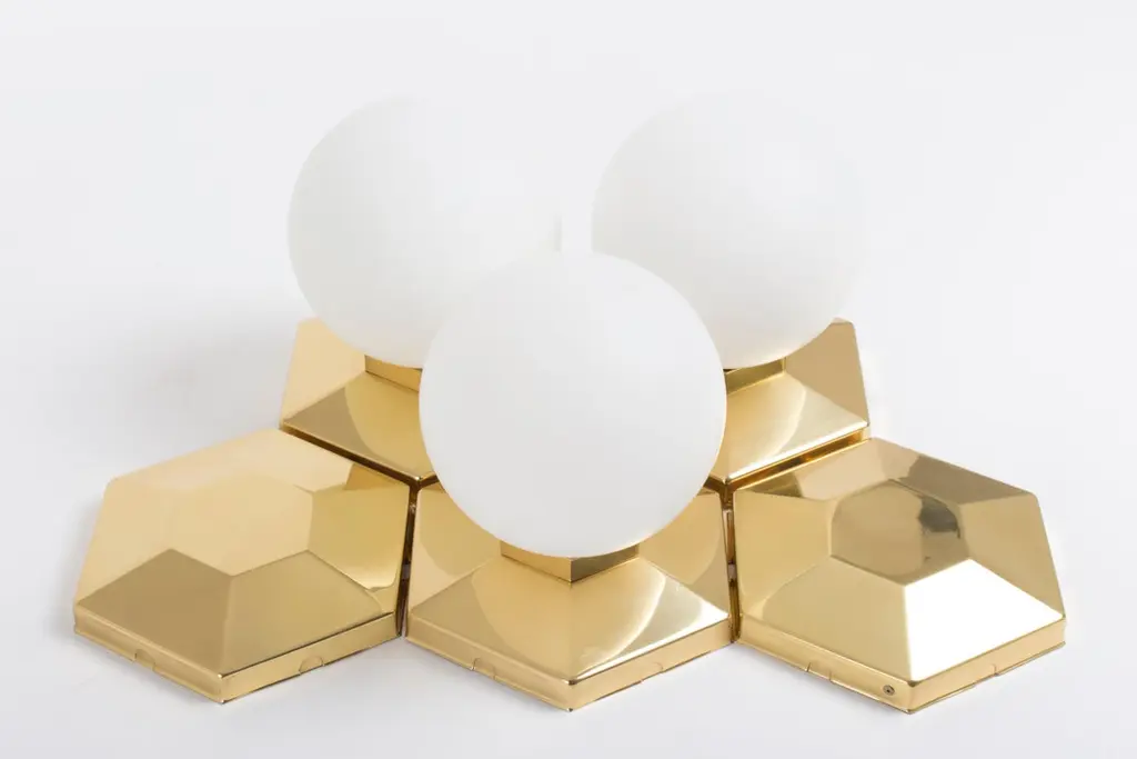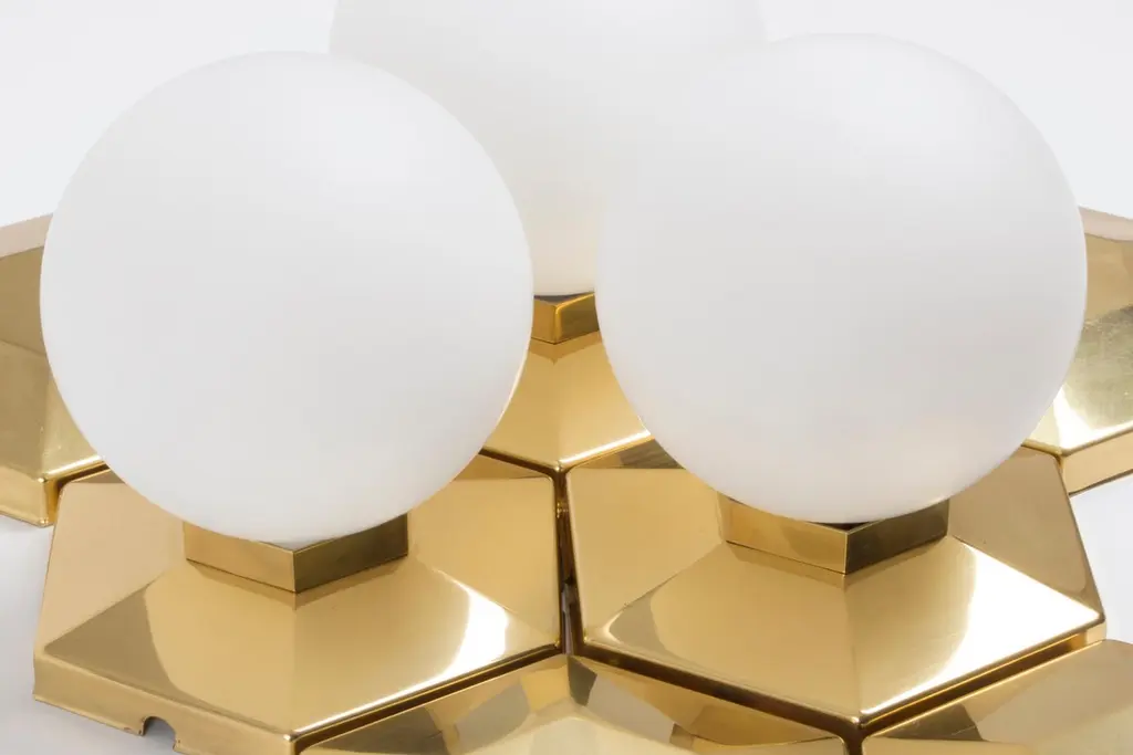 Set of multiple brass and glass flush mounts for modular installation, priced per piece (blank or opal glass-sphere) from 1970's- Design by Rolf Krüger for Neuhaus.They will also work as wall mounted lights.We have 40 pieces with opal glass lights and 12 with blind/blank brass tiles left, please note that we grant considerable discounts for multiple purchases, since this concept for this lighting is working only with several pieces.The modular pieces in general are consisting from hexagonal brass tiles featuring two different elements (opal ball lights on base and hexagonal brass tiles) that can be combined in various ways.Dimensions are 7.28" x 7.28" x 7.48" (height); 5.51" diameter for the opal glass balls only.