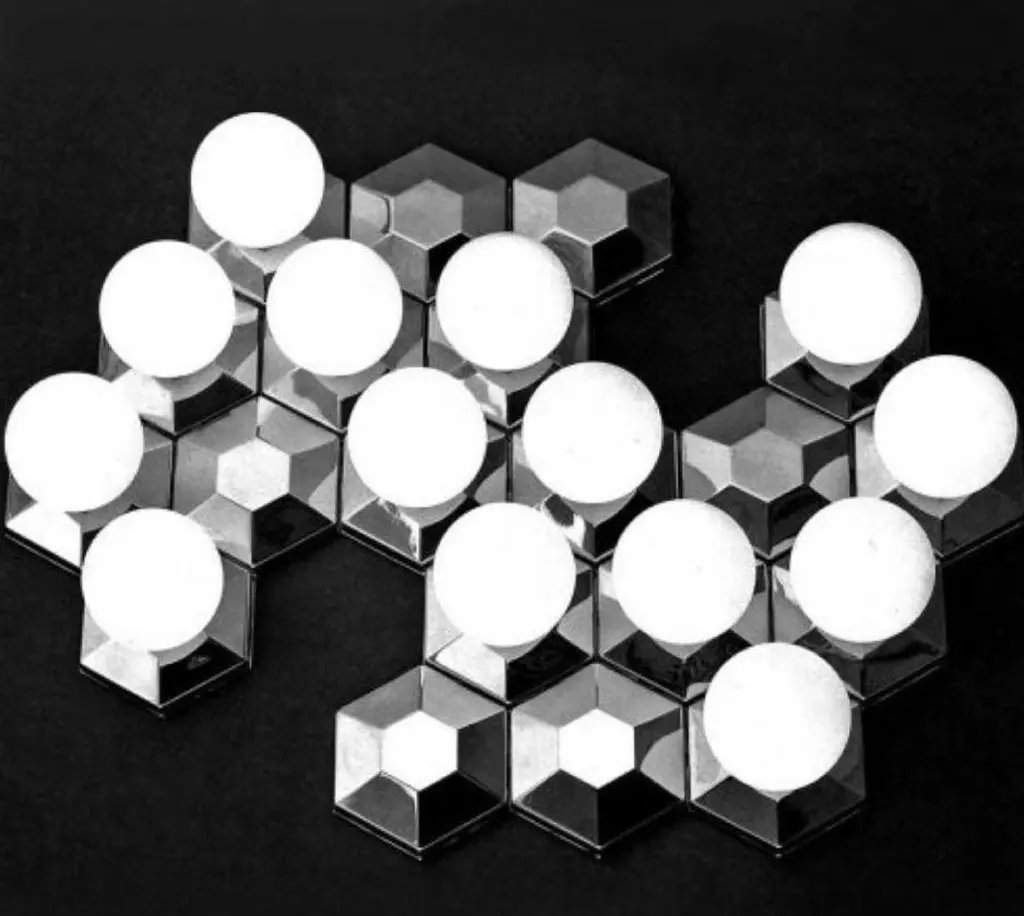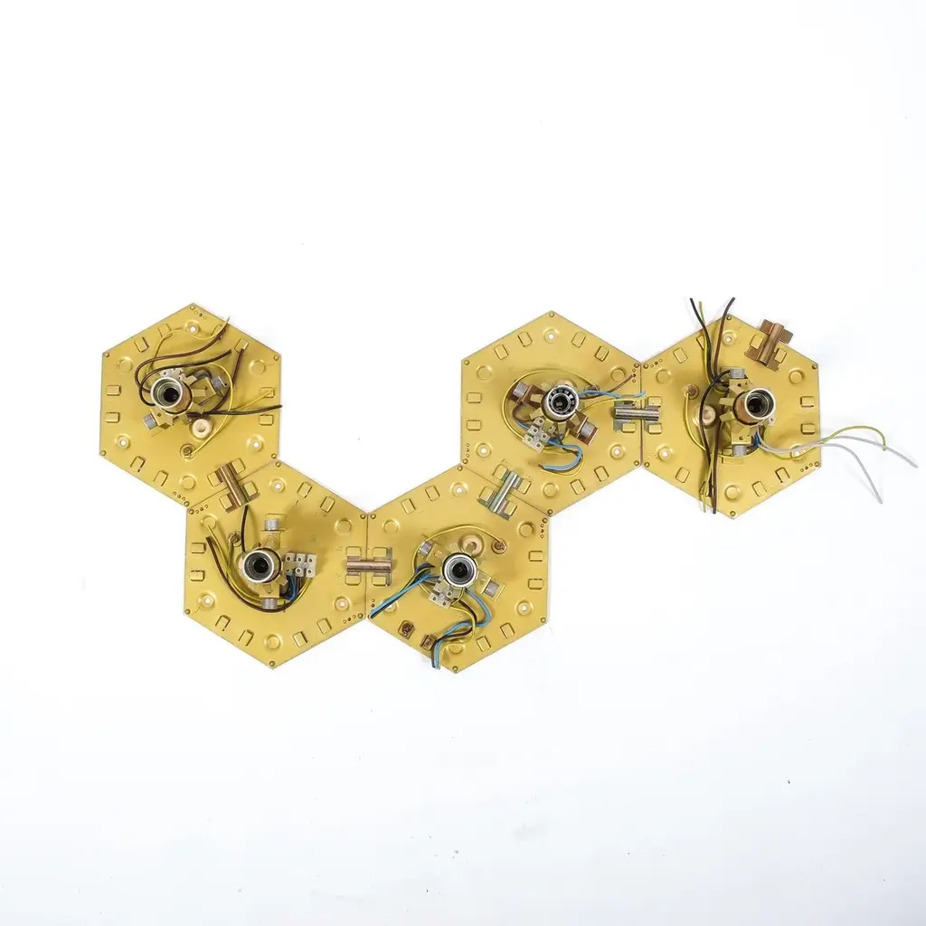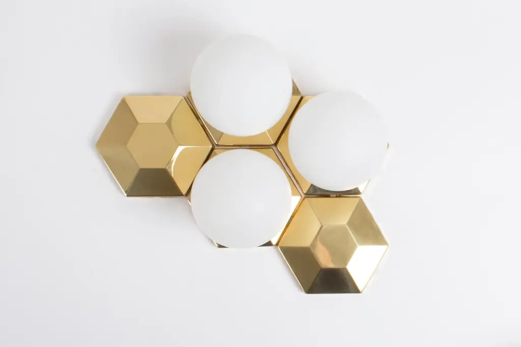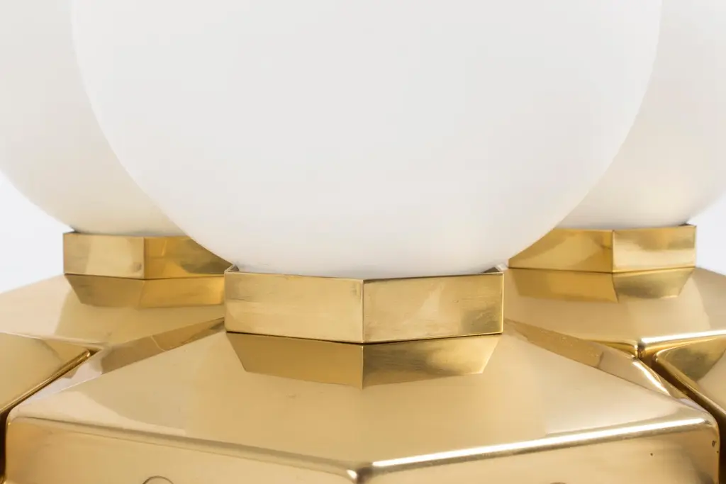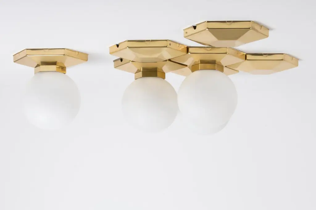 Set of multiple brass and glass flush mounts for modular installation, priced per piece (blank or opal glass-sphere) from 1970's- Design by Rolf Krüger for Neuhaus.They will also work as wall mounted lights.We have 40 pieces with opal glass lights and 12 with blind/blank brass tiles left, please note that we grant considerable discounts for multiple purchases, since this concept for this lighting is working only with several pieces.The modular pieces in general are consisting from hexagonal brass tiles featuring two different elements (opal ball lights on base and hexagonal brass tiles) that can be combined in various ways.Dimensions are 7.28" x 7.28" x 7.48" (height); 5.51" diameter for the opal glass balls only.