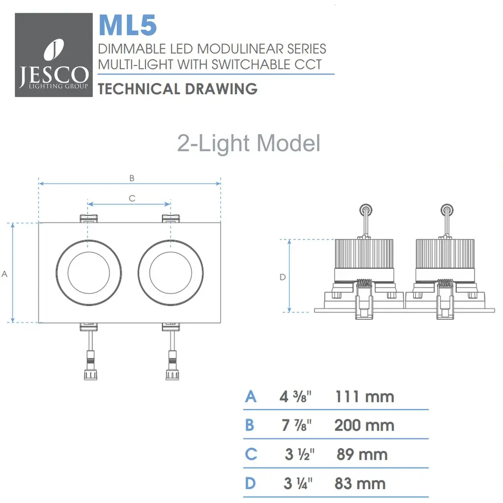 The latest addition to JESCO Lighting’s multiple recessed downlights is the ML5 Modulinear Series. Designed to integrate perfectly with modern contemporary spaces, the ML5 provides a visually clean geometric look for upscale retail, offices, hospitality venues including restaurants, hotels, public spaces; galleries and museums; high-end residential spaces. Features Contemporary flush-to-ceiling design with adjustable gimbals provides a 15° tilt and 360° rotation. Offered in 1-, 2-, and 3-lightconfigurations in a beautiful white or black finish. Aluminum construction with exceptional thermal management ensures long operating life. Switchable 5-level colortemperature from a warm 2700K to a cool 5000K facilitates easy lighting change as the interiors of the space changes. Suitable for Remodel and New Construction ceilings with optional mounting plates, Airtight and IC-rated housings. The one-light ML5 fixture is available with emergency ballast option. Triac dimming.
