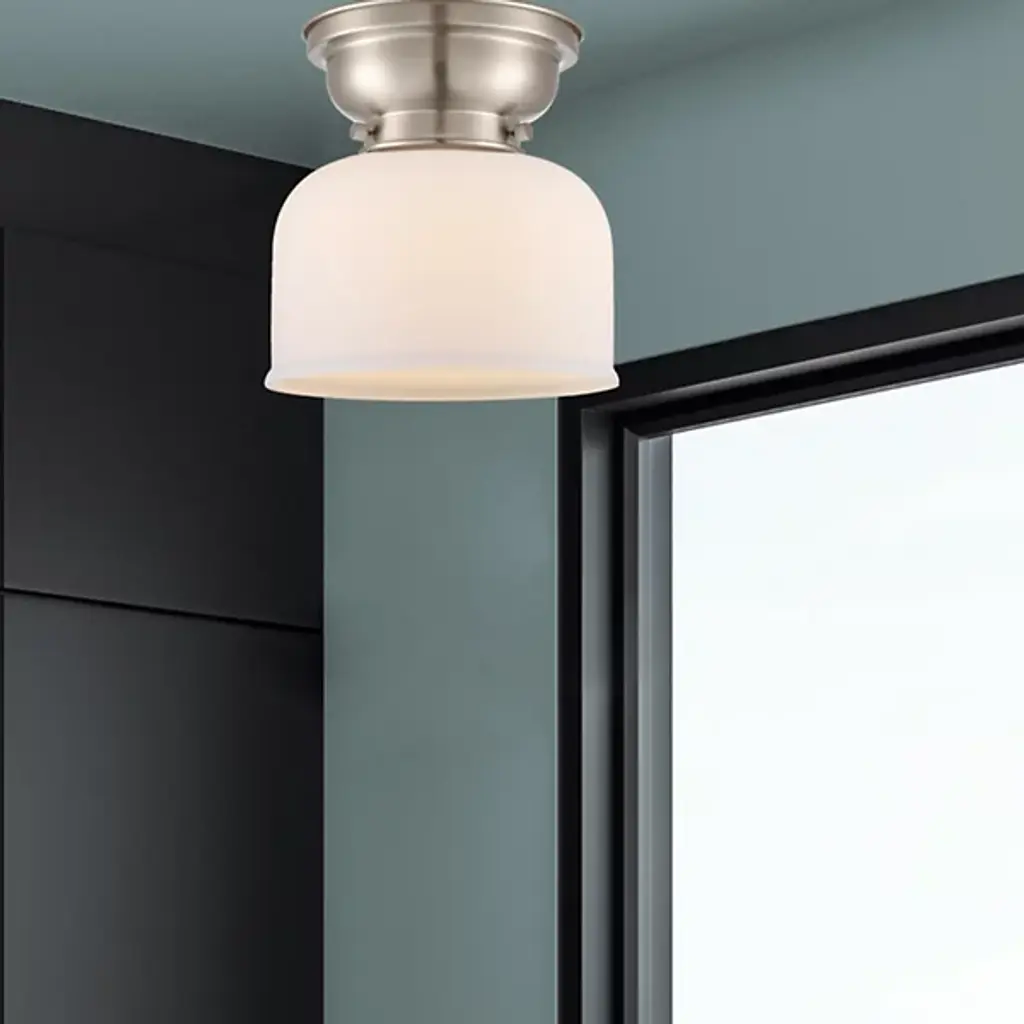 Add old-world elegance to your interior spaces with the elegant lines of the Moriah Flushmount by Alder & Ore. Secured to the ceiling by a contoured bowl mount of smoothly-finished steel, it uses three knurled knobs to hold a glass bell shade around the sides of a single socket. The fixture is compatible with a variety of bulbs but particularly stands out when paired with a vintage-style filament bulb that sends down a bright wash of light from above, gentled into a warm ambiance through the clear glass sides.