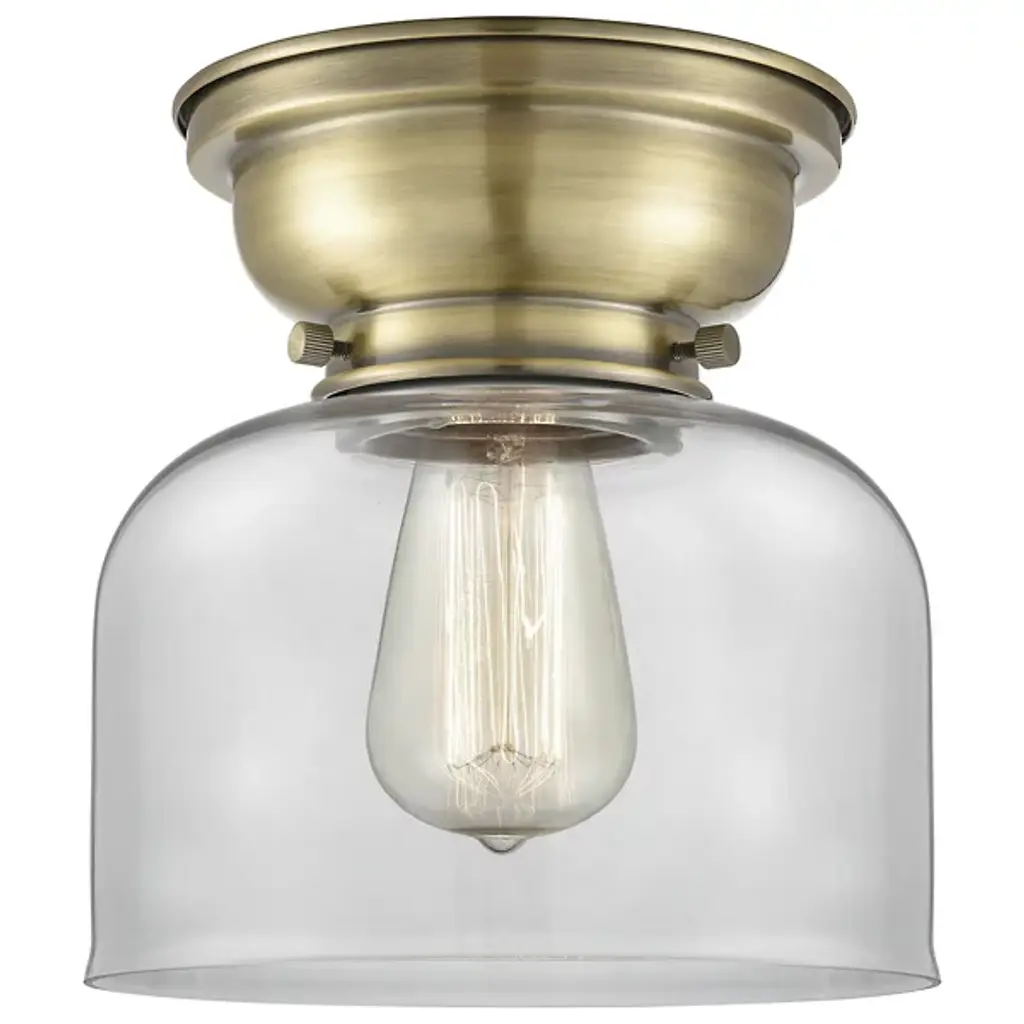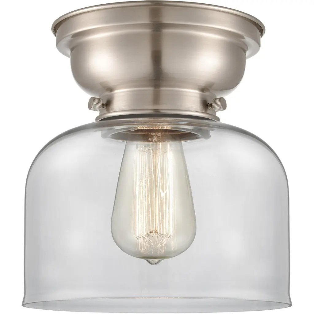 Add old-world elegance to your interior spaces with the elegant lines of the Moriah Flushmount by Alder & Ore. Secured to the ceiling by a contoured bowl mount of smoothly-finished steel, it uses three knurled knobs to hold a glass bell shade around the sides of a single socket. The fixture is compatible with a variety of bulbs but particularly stands out when paired with a vintage-style filament bulb that sends down a bright wash of light from above, gentled into a warm ambiance through the clear glass sides.
