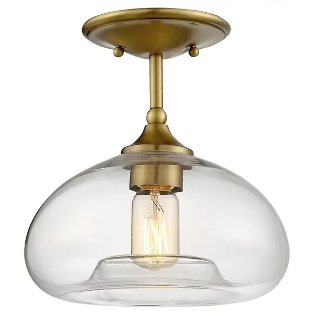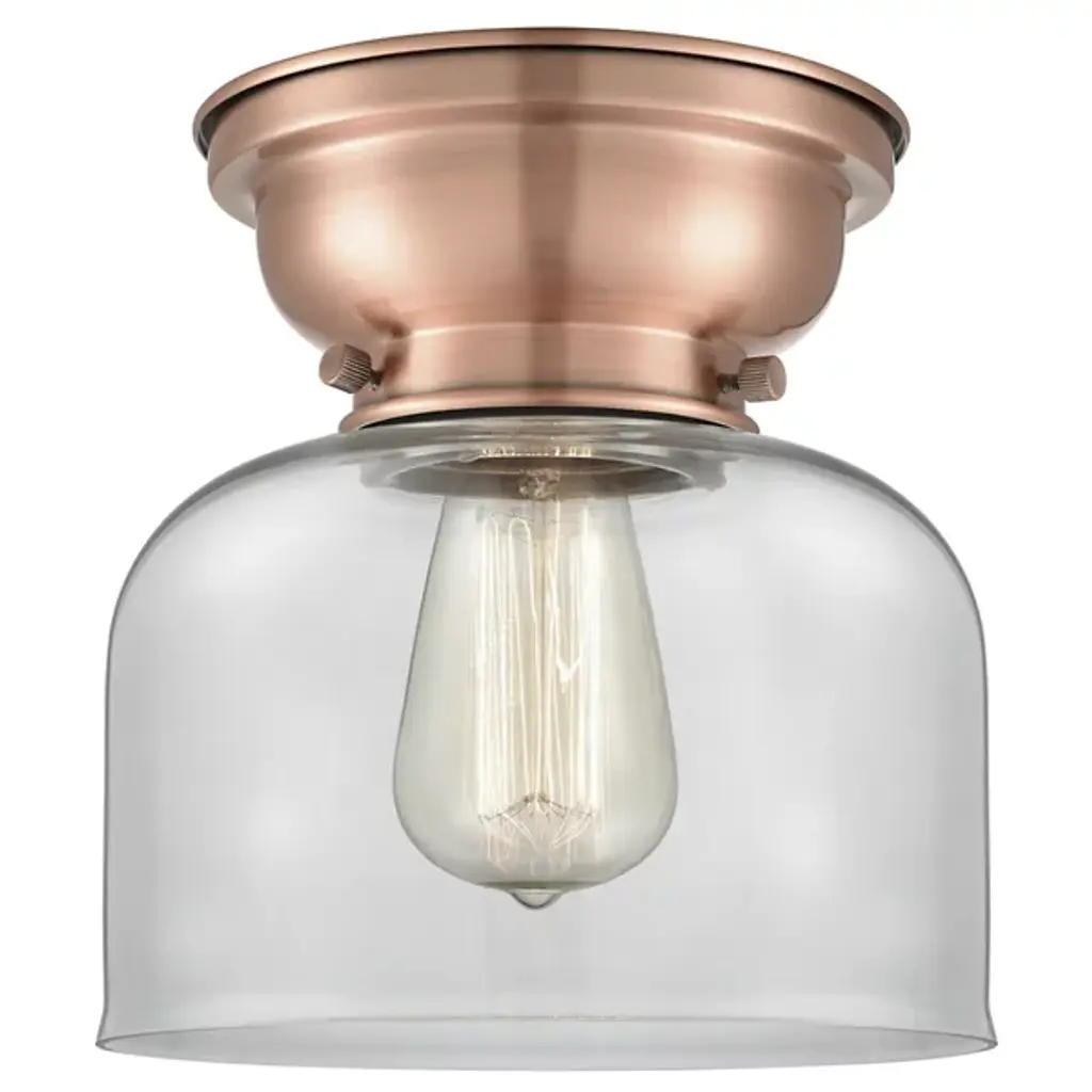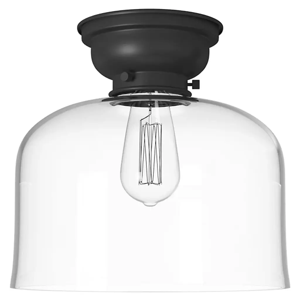 Add old-world elegance to your interior spaces with the elegant lines of the Moriah Flushmount by Alder & Ore. Secured to the ceiling by a contoured bowl mount of smoothly-finished steel, it uses three knurled knobs to hold a glass bell shade around the sides of a single socket. The fixture is compatible with a variety of bulbs but particularly stands out when paired with a vintage-style filament bulb that sends down a bright wash of light from above, gentled into a warm ambiance through the clear glass sides.