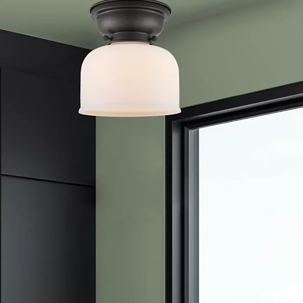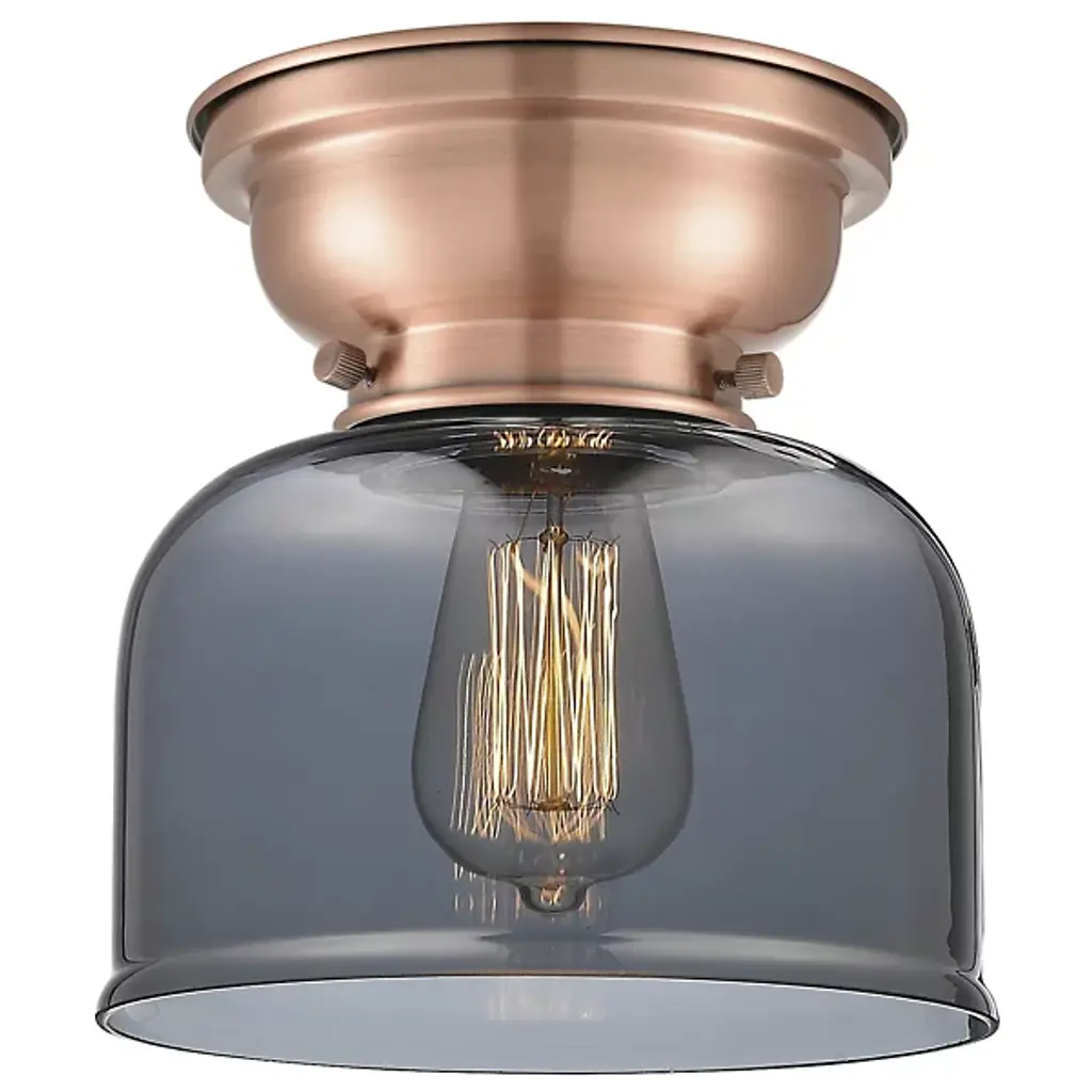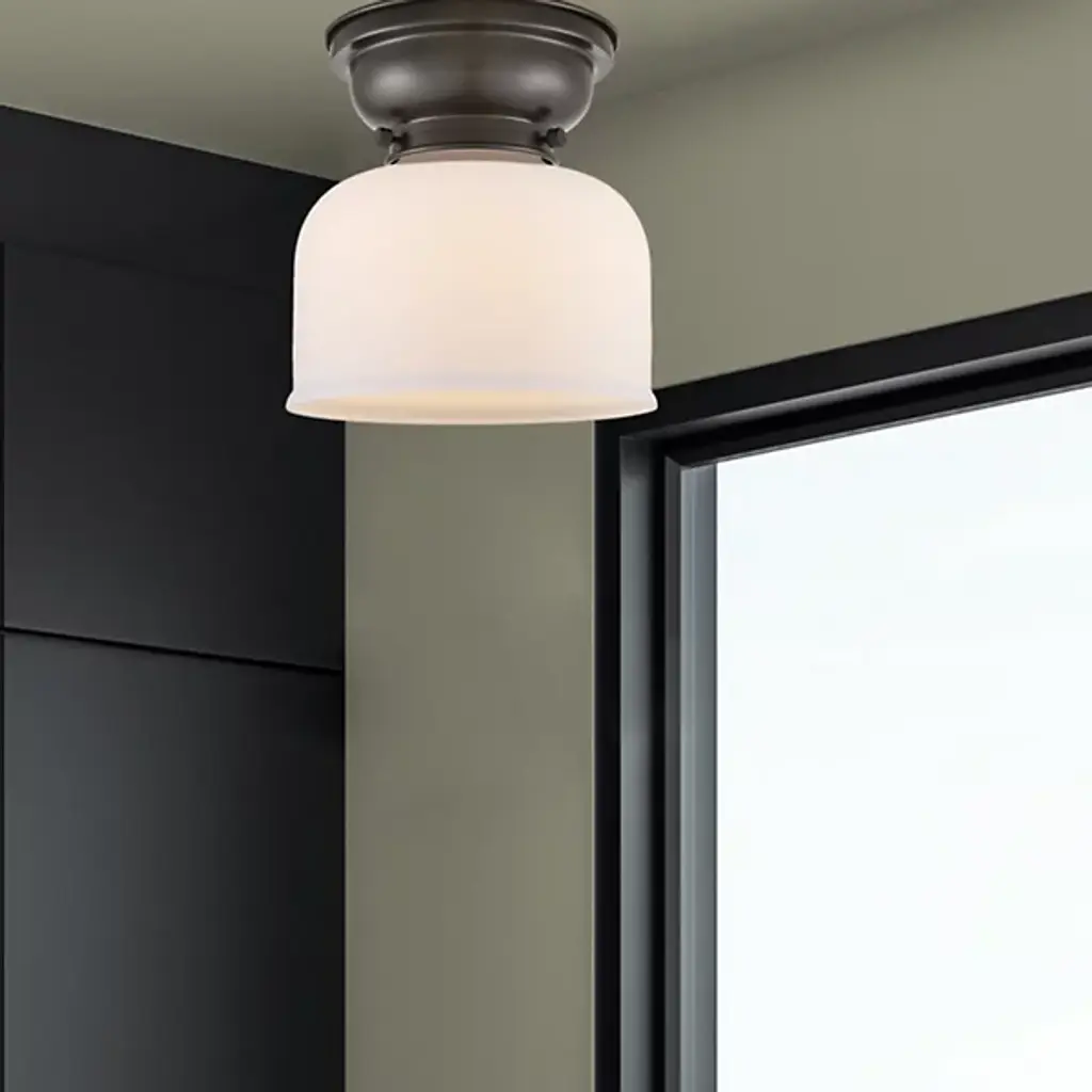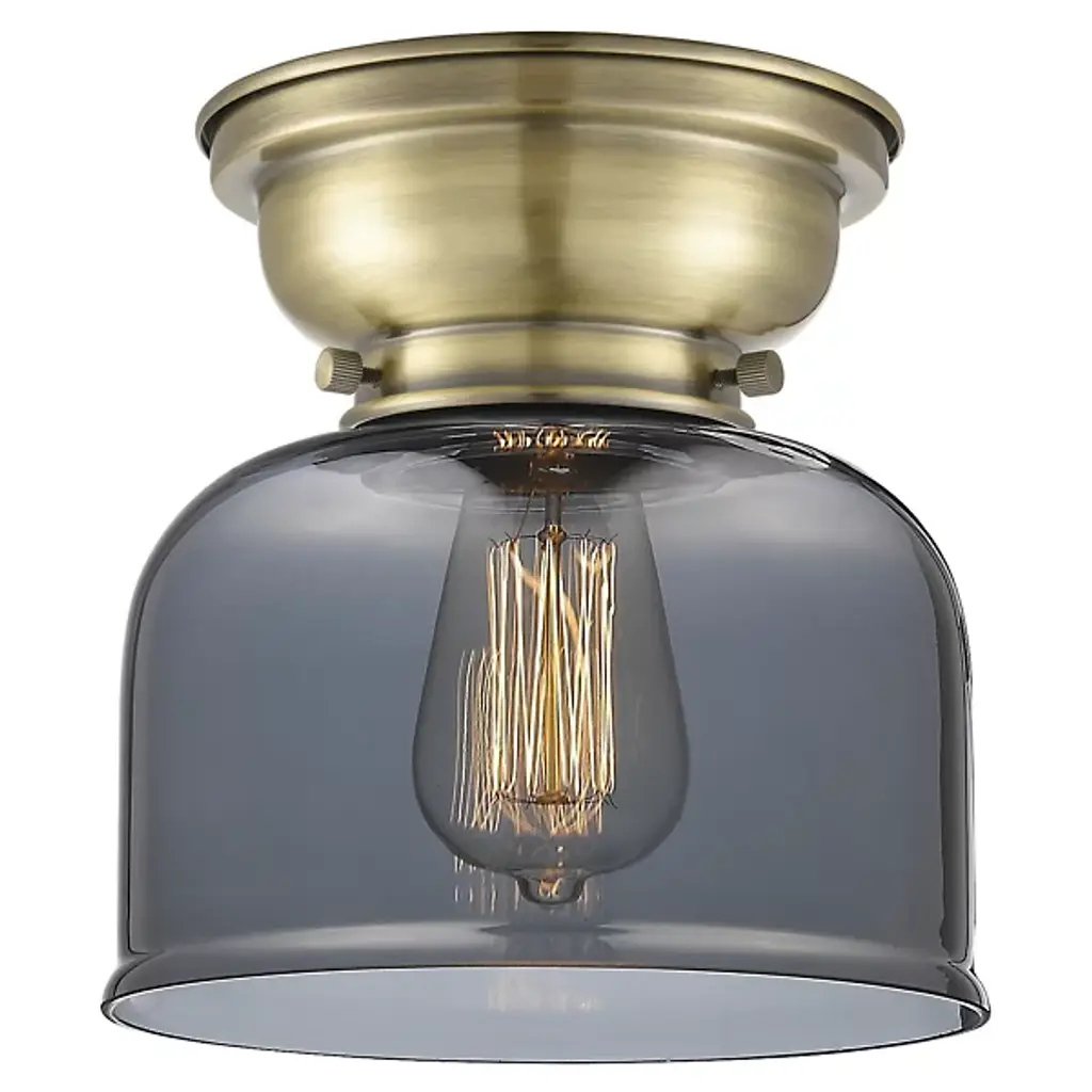 Add old-world elegance to your interior spaces with the elegant lines of the Moriah Flushmount by Alder & Ore. Secured to the ceiling by a contoured bowl mount of smoothly-finished steel, it uses three knurled knobs to hold a glass bell shade around the sides of a single socket. The fixture is compatible with a variety of bulbs but particularly stands out when paired with a vintage-style filament bulb that sends down a bright wash of light from above, gentled into a warm ambiance through the clear glass sides.