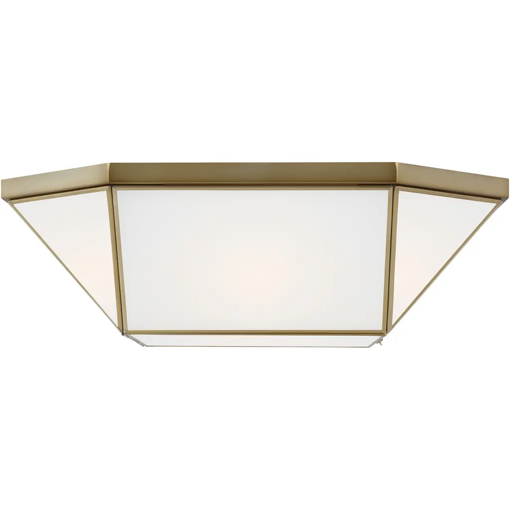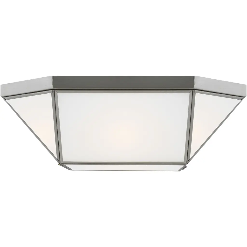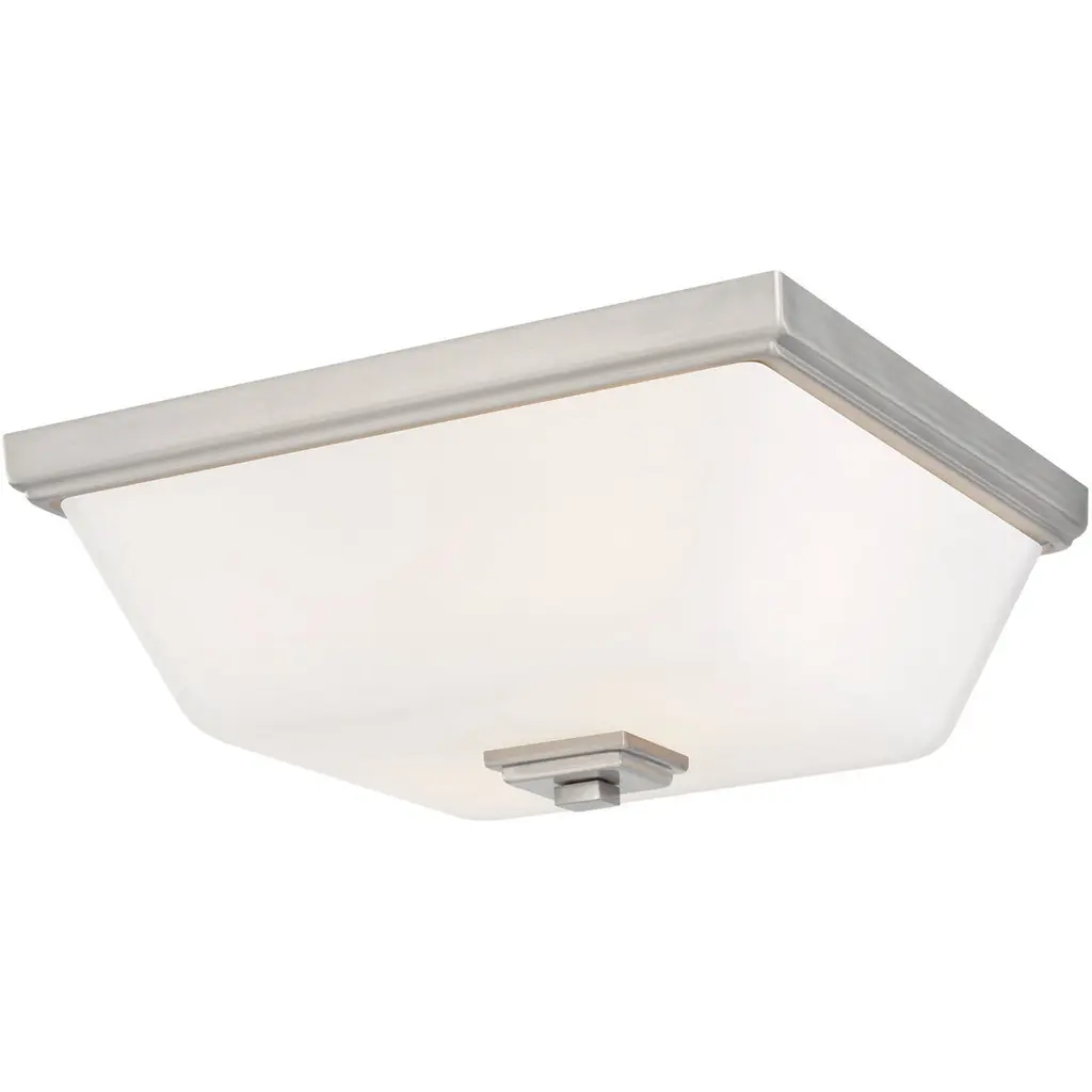 Bring clean lines and sharp, precise angles to the comfort of your modern home with the Morrison Flushmount from Visual Comfort Studio, formerly known as Sea Gull Lighting, Connecting directly to the ceiling, this piece features a clean metal frame that mounts a smooth white glass shade. Geometric panels lower into the room, encapsulating the set of two bulbs within. The light from the bulbs is bright and even, diffusing through the material in a welcoming manner before entering the room.