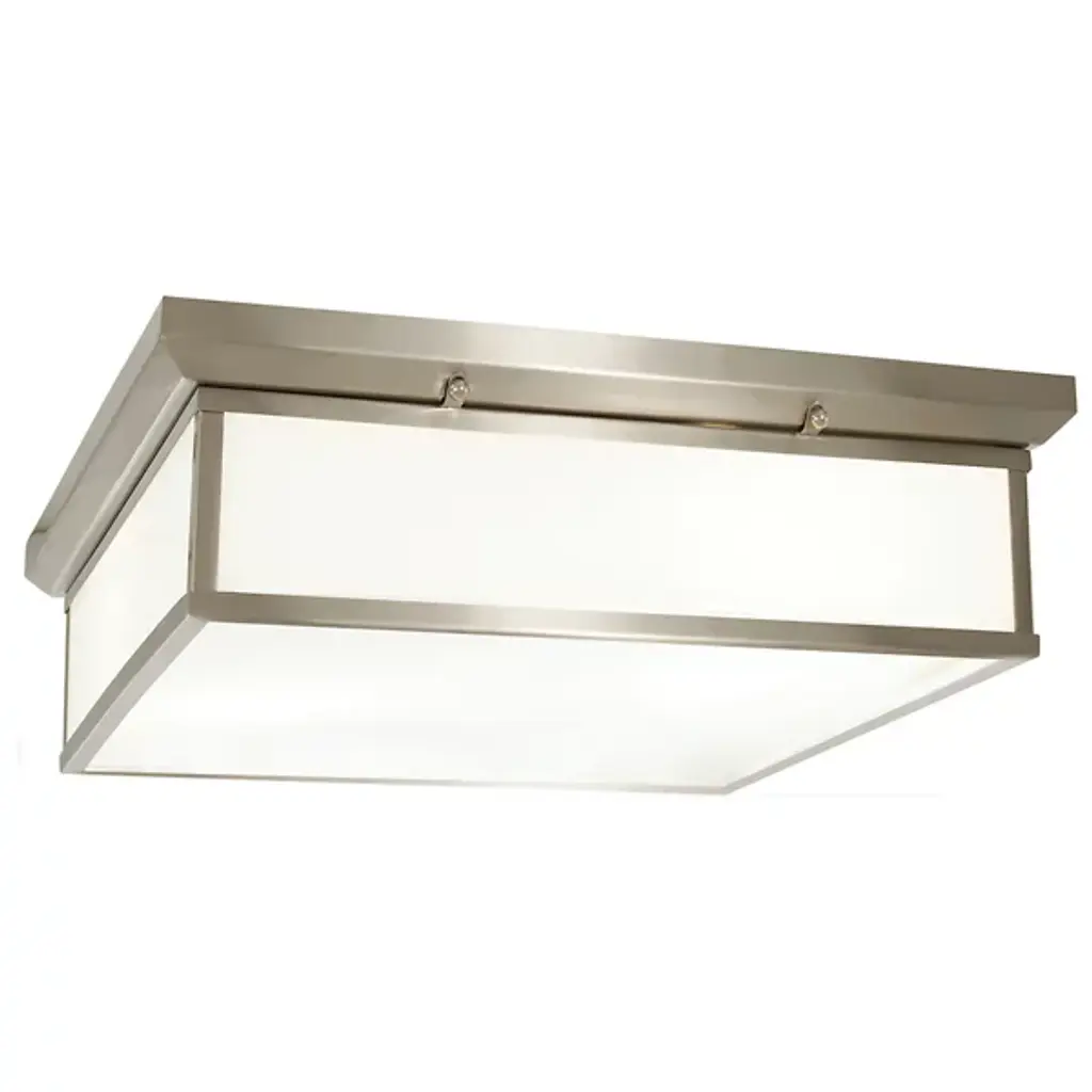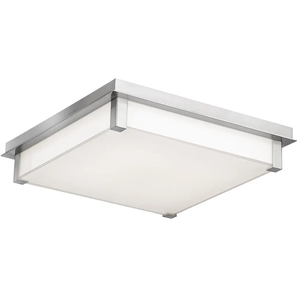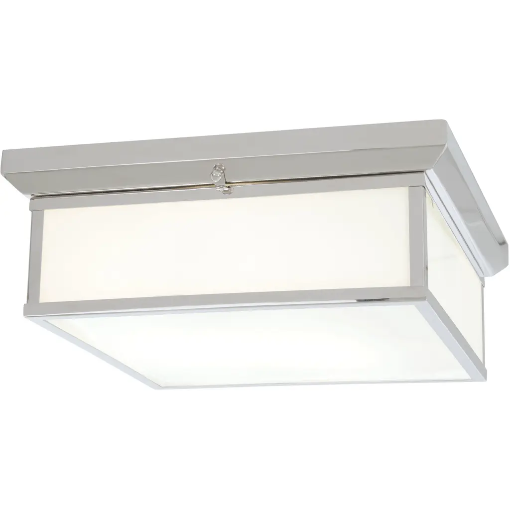 Bring clean lines and sharp, precise angles to the comfort of your modern home with the Morrison Flushmount from Visual Comfort Studio, formerly known as Sea Gull Lighting, Connecting directly to the ceiling, this piece features a clean metal frame that mounts a smooth white glass shade. Geometric panels lower into the room, encapsulating the set of two bulbs within. The light from the bulbs is bright and even, diffusing through the material in a welcoming manner before entering the room.