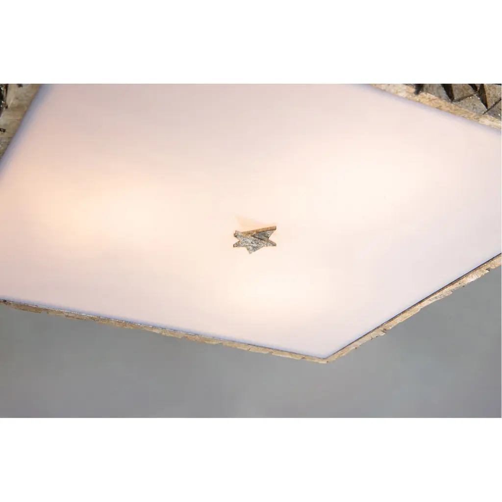 The unique and versatile square Mosaic flush mount, in a rich antique silver finish features a single piece of white glass that gives a perfectly diffused light, and unique gold mosaic pieces. Using the 16 inch square shape for a touch of modern, this antique silver fixture can blend in traditional and contempory settings showing our attention to details while working great in bedrooms, closets and other living spaces.