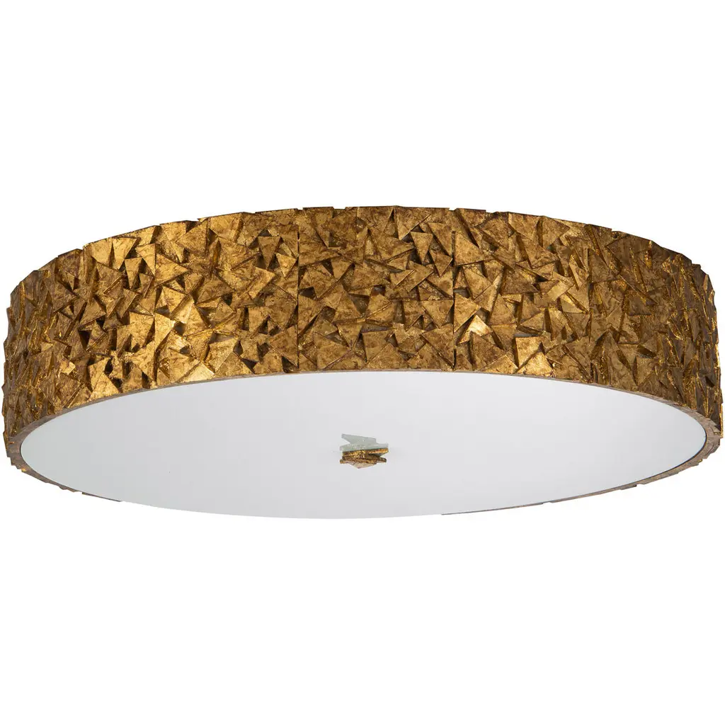 This eye-catching centerpiece uses pieces of our Mosaic collection for inspiration, giving this 4 light flush mounted ceiling light a very charming and finished look. Using the 20 inch round shape for a touch of modern, this antique gold flush mount fixture has the best of both a traditional and contempory design. Using a diffused white glass to give off a crisp and flattering light, making this ceiling fixture a great look to finish a bedroom, closet, or living room.