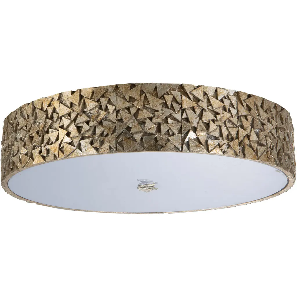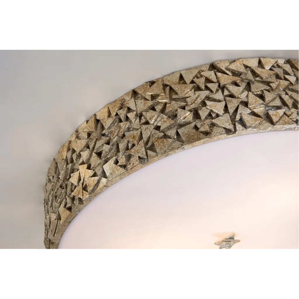 This eye-catching centerpiece uses pieces of our Mosaic collection for inspiration, giving this 4 light flush mounted ceiling light a charming and finished look. Using the 20 inch round shape for a touch of modern, this antique silver flush mount fixture has the best of both a traditional and contempory design. Using a diffused white glass to give off a crisp and flattering light, making this ceiling fixture a great look to finish a bedroom, closet, or living room.