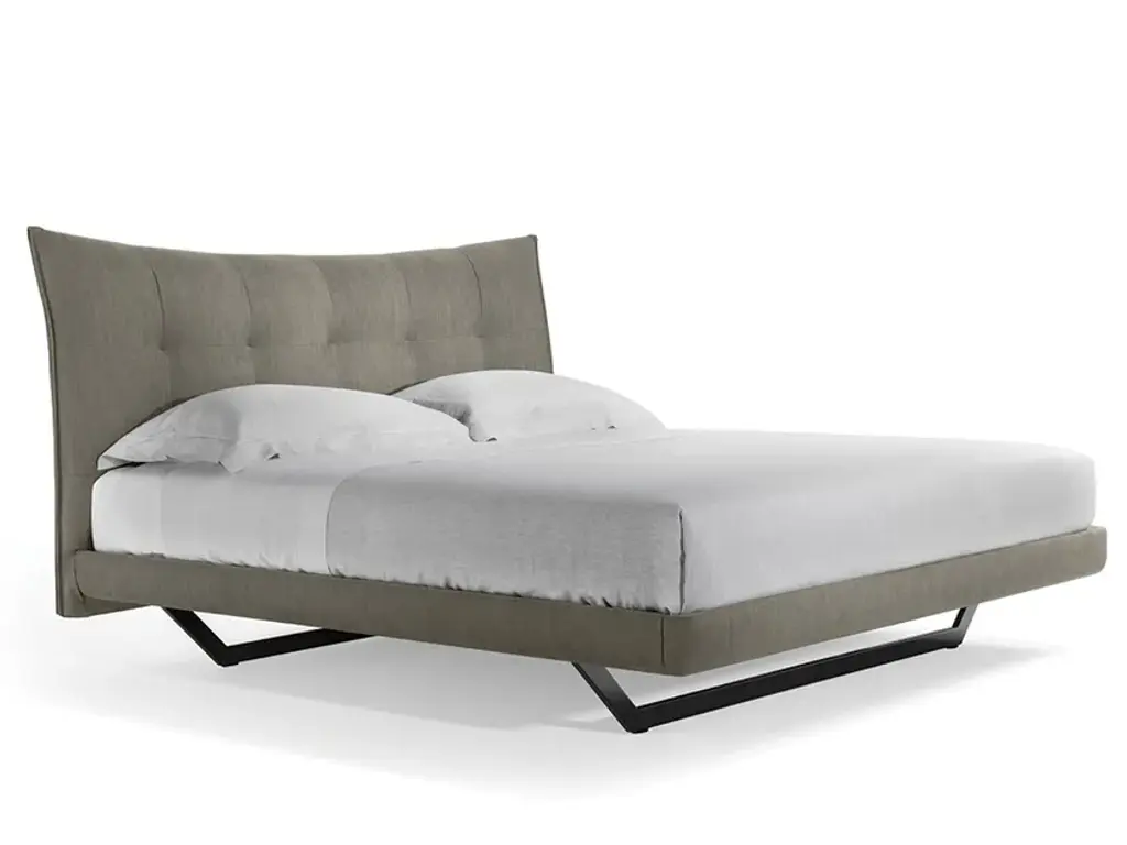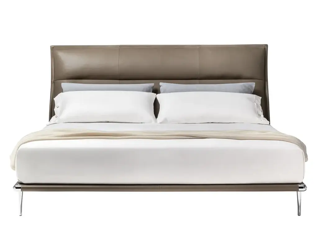 Ludovica + Roberto Palomba designed Mr Moonlight with the same philosophy that inspired Let it be. A relaxed and informal style, a profound sensation of comfort and liberty, and the same lightness of design.The headboard is like a large, soft pillow, embellished with simple central stitching and elaborate edges. The bed surface sits atop a metal structure finely upholstered in saddle leather or leather, like the sofa seats. Once again the feet are positioned in from the corners and, even higher than in the sofa, intensify the sense that the volumes are floating suspended.The study of proportions is perfectly calibrated and strives to avoid any possible visual obstacle. The bed frame, flush with the mattress, replicates the structure of the sofa where the seat cushion is flush with the supporting frame. The result is a compact series of volumes that stands out for its subtle elegance.The headboard structure is in solid poplar and birch plywood with polyurethane foam padding and a goose down cushion. The sides and footboard in die-cast aluminium, while the corners and feet in moulded aluminium with ruthenium finish. The bed surfaces are in birch plywood. The upholstery of the base and headboard comes in Pelle Frau® leather from the Color System or Nest leather, also combined with fabrics, or in Cuoio Saddle leather combined with Pelle Frau® leather or fabric.