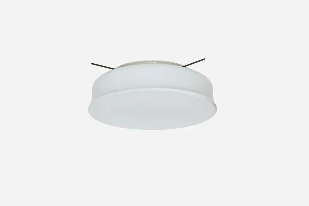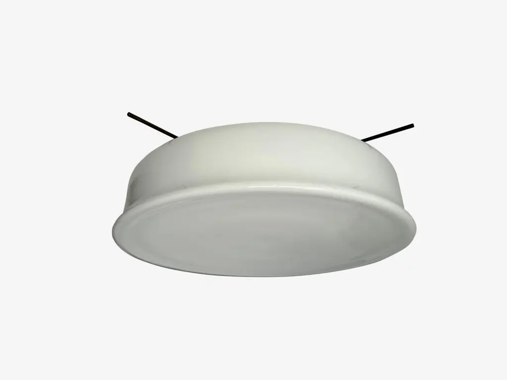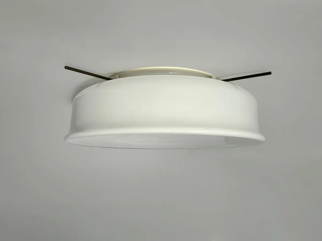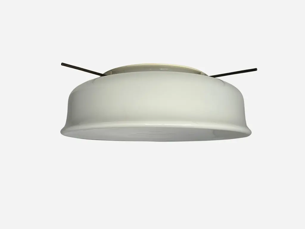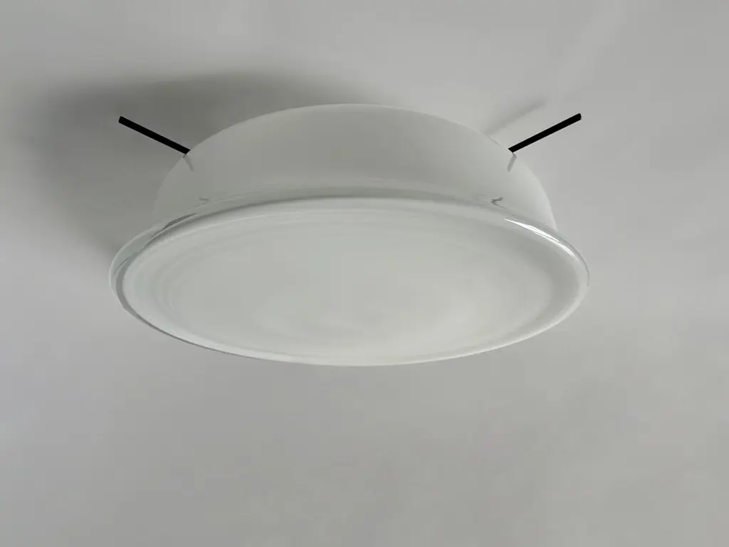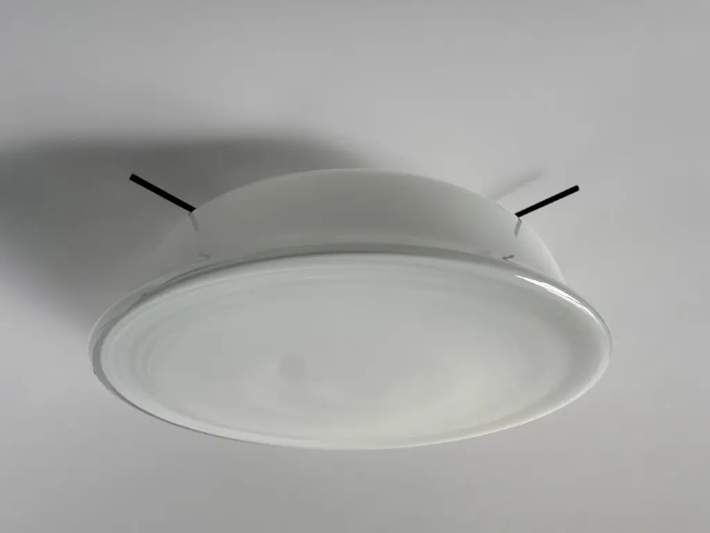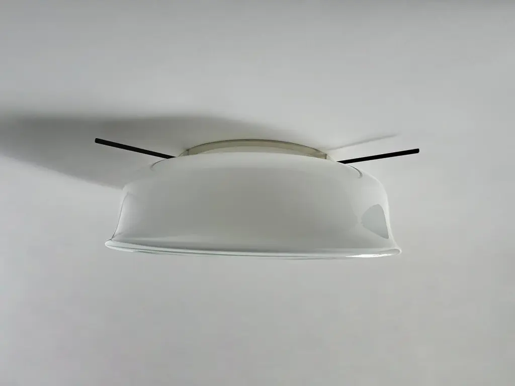 Murano glass flush mount ceiling light by Vistosi, attributed.Glass is probably made by Vistosi, metal frame is new and custom made.Designed and made in Italy, 1960s.White opaline glass, enameled metal.Takes 3 Edison bulbs.Complimentary US rewiring upon request.Price is for ONE flush mount.5 flush mounts are available.Also 5 flush mounts are available with a smaller 15 inches diameter.FREE US rewiring upon request.FREE US Continental shipping.NO TARIFFS, Duties or Customs fees on US orders.We are located in the US.We take pride in bringing vintage fixtures to their full glory again.At Illustris Lighting our main focus is to deliver lighting fixtures to our clients in ready to install condition. Every item in our collection goes through strict condition inspection and receives careful restoration if it’s needed.We work with highly skilled restorers, the very best in the business. They are experts in European lighting and happy to do custom modifications, exquisite patinas and give the vintage lights their second lease on life.Every single fixture comes with a complimentary US rewiring and adapted to US standards.