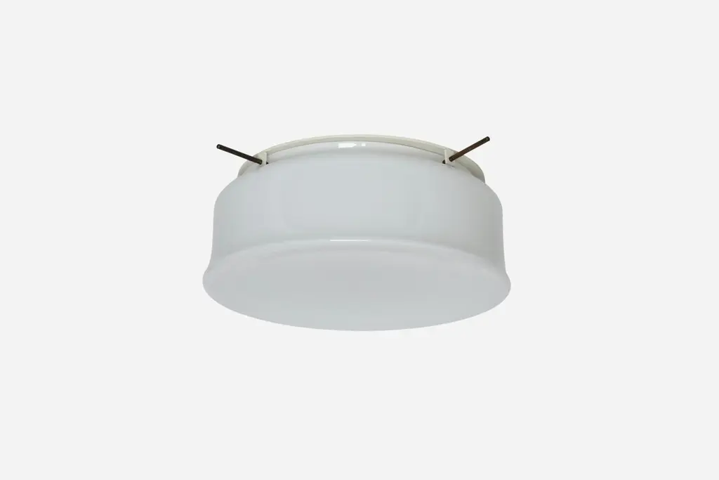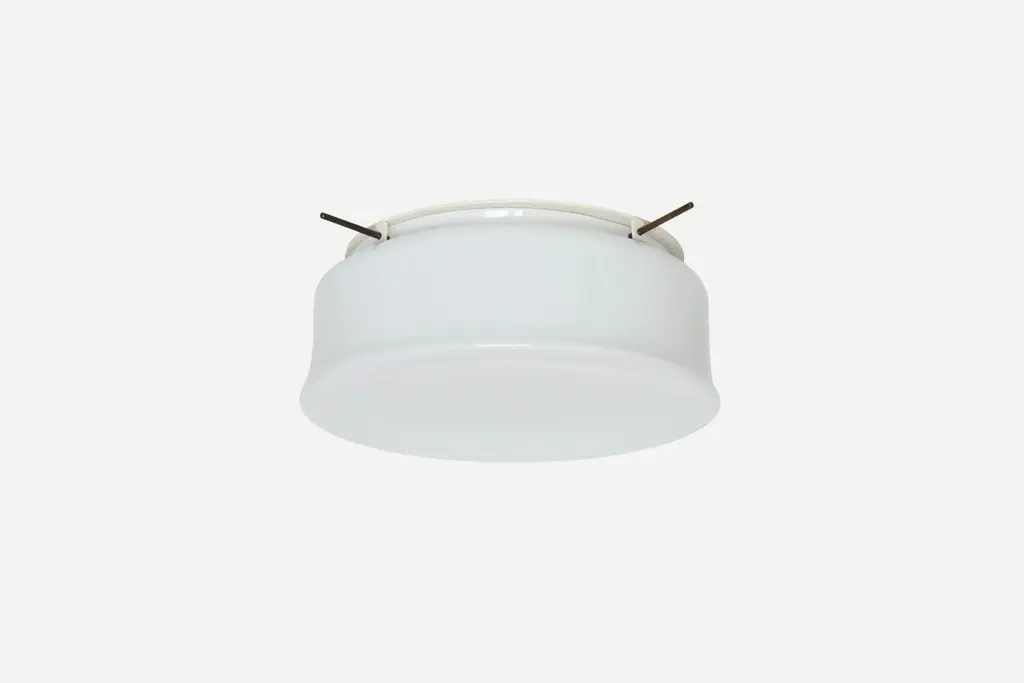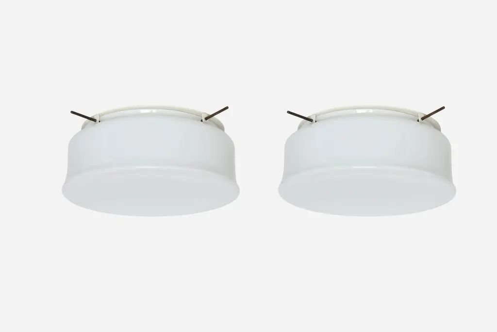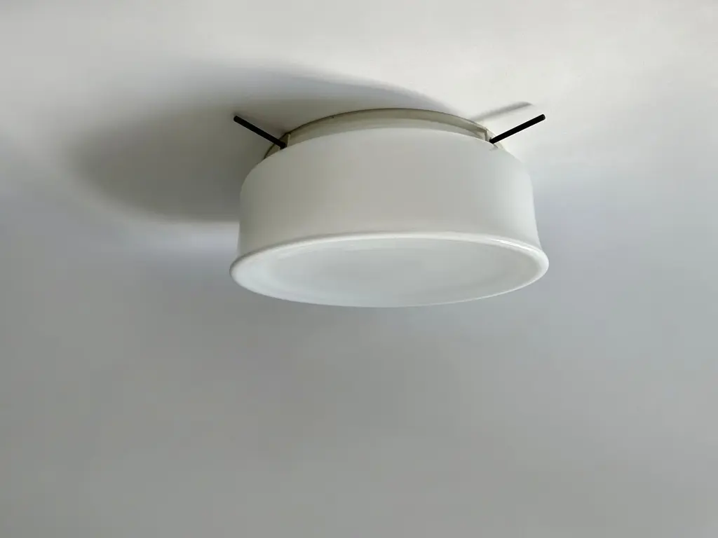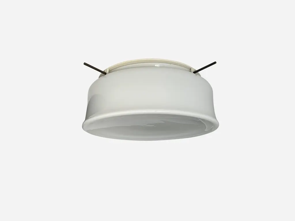 Murano glass flush mount ceiling light by Vistosi, attributed.Glass is possibly made by Vistosi, metal frame is new and custom made.Designed and made in Italy.White opaline glass, enameled metal.Takes 3 Edison bulbs.Complimentary US rewiring upon request.Price is for ONE flush mount.5 flush mounts are available.Also 5 lights are available in a larger 19 inches diameter.FREE US rewiring upon request.FREE US Continental shipping.NO TARIFFS, Duties or Customs fees on US orders.We are located in the US.We take pride in bringing vintage fixtures to their full glory again.At Illustris Lighting our main focus is to deliver lighting fixtures to our clients in ready to install condition. Every item in our collection goes through strict condition inspection and receives careful restoration if it’s needed.We work with highly skilled restorers, the very best in the business. They are experts in European lighting and happy to do custom modifications, exquisite patinas and give the vintage lights their second lease on life.Every single fixture comes with a complimentary US rewiring and adapted to US standards.