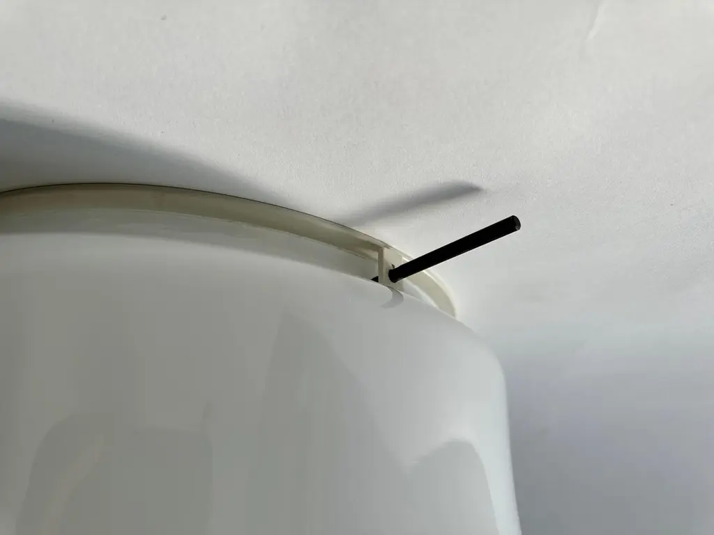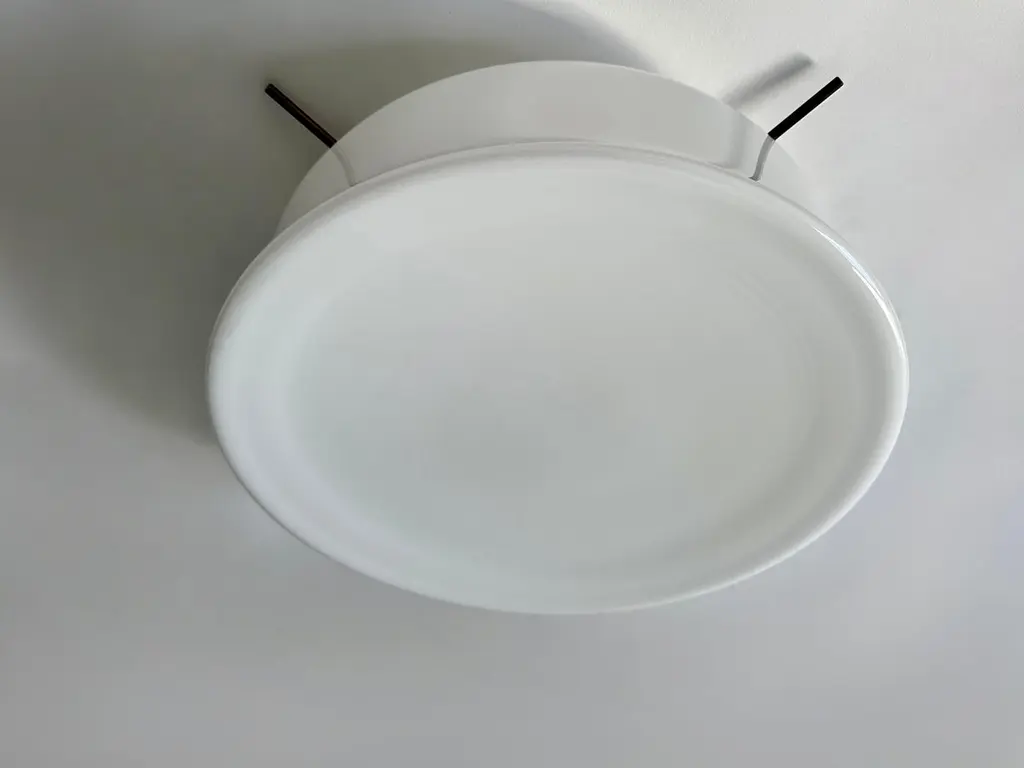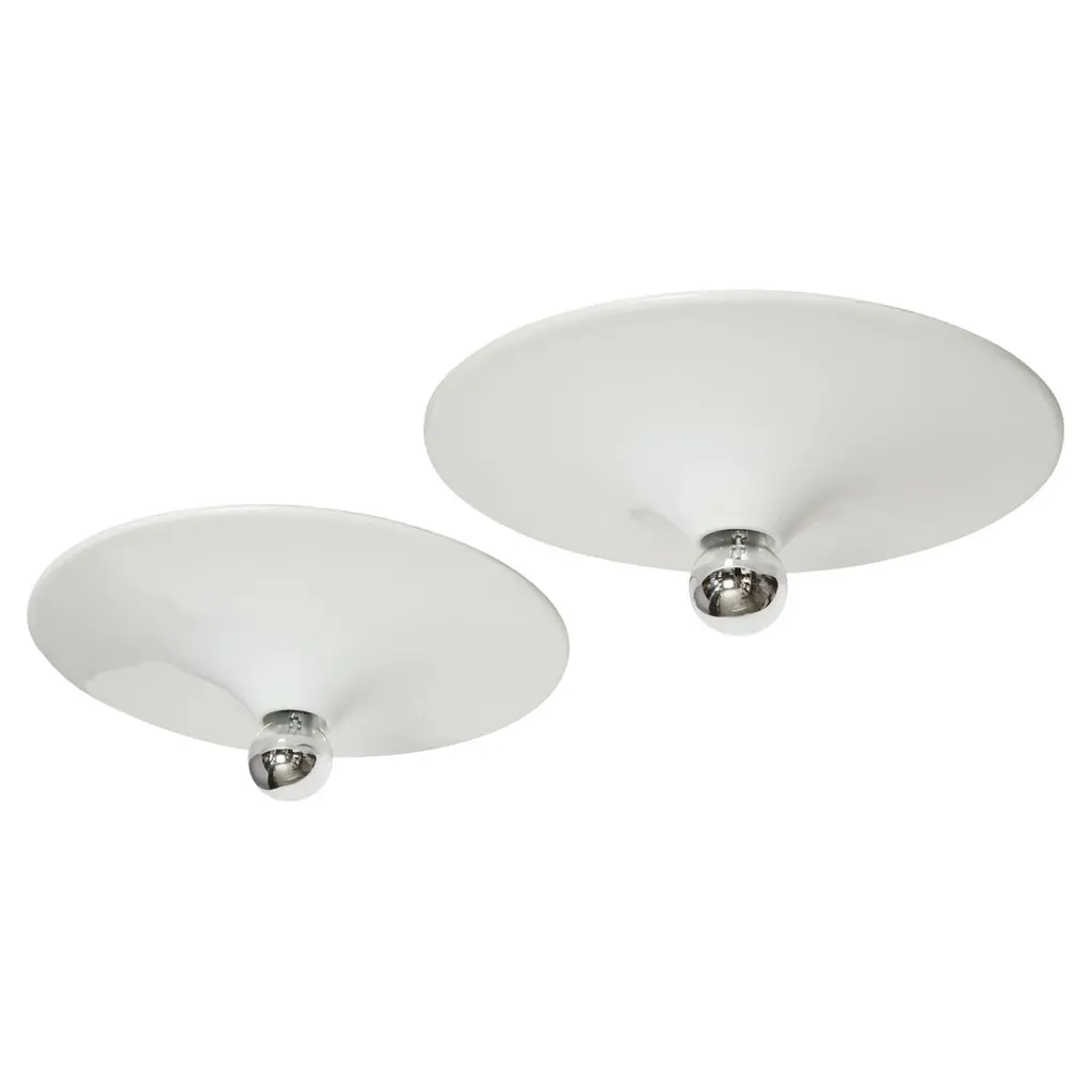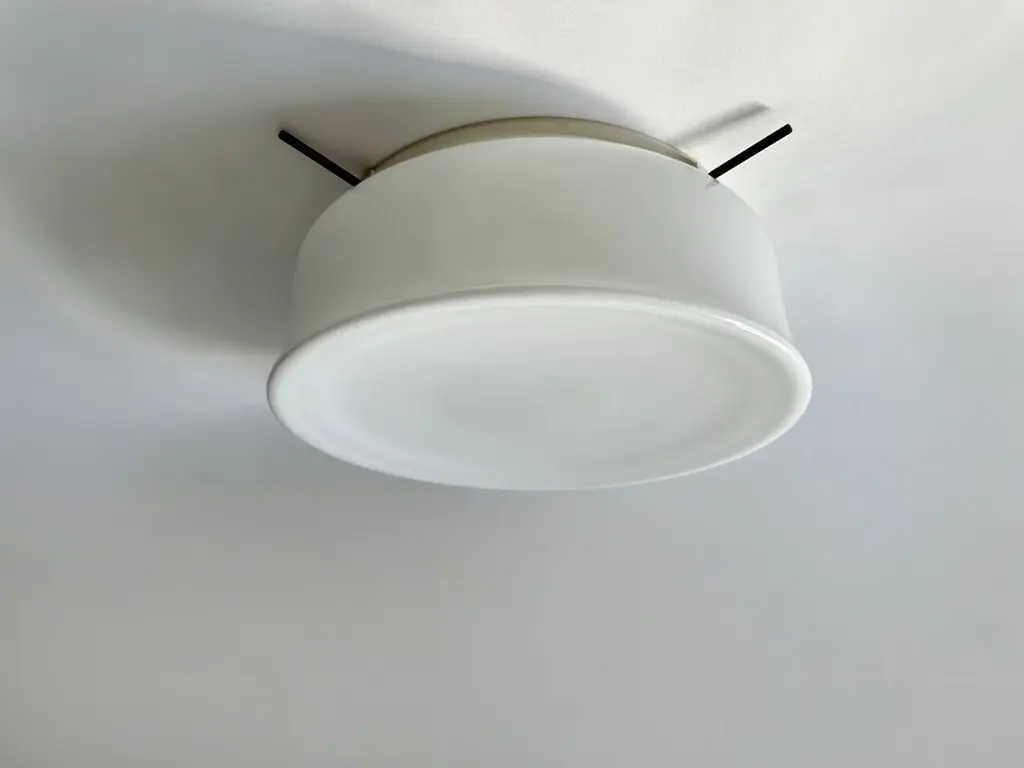 Murano glass flush mount ceiling light by Vistosi, attributed.Glass is possibly made by Vistosi, metal frame is new and custom made.Designed and made in Italy.White opaline glass, enameled metal.Takes 3 Edison bulbs.Complimentary US rewiring upon request.Price is for ONE flush mount.5 flush mounts are available.Also 5 lights are available in a larger 19 inches diameter.FREE US rewiring upon request.FREE US Continental shipping.NO TARIFFS, Duties or Customs fees on US orders.We are located in the US.We take pride in bringing vintage fixtures to their full glory again.At Illustris Lighting our main focus is to deliver lighting fixtures to our clients in ready to install condition. Every item in our collection goes through strict condition inspection and receives careful restoration if it’s needed.We work with highly skilled restorers, the very best in the business. They are experts in European lighting and happy to do custom modifications, exquisite patinas and give the vintage lights their second lease on life.Every single fixture comes with a complimentary US rewiring and adapted to US standards.
