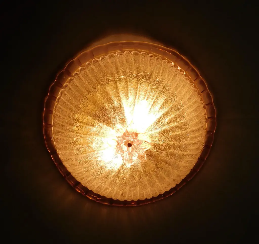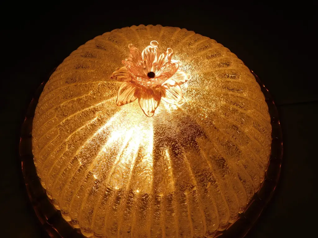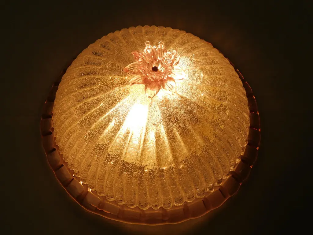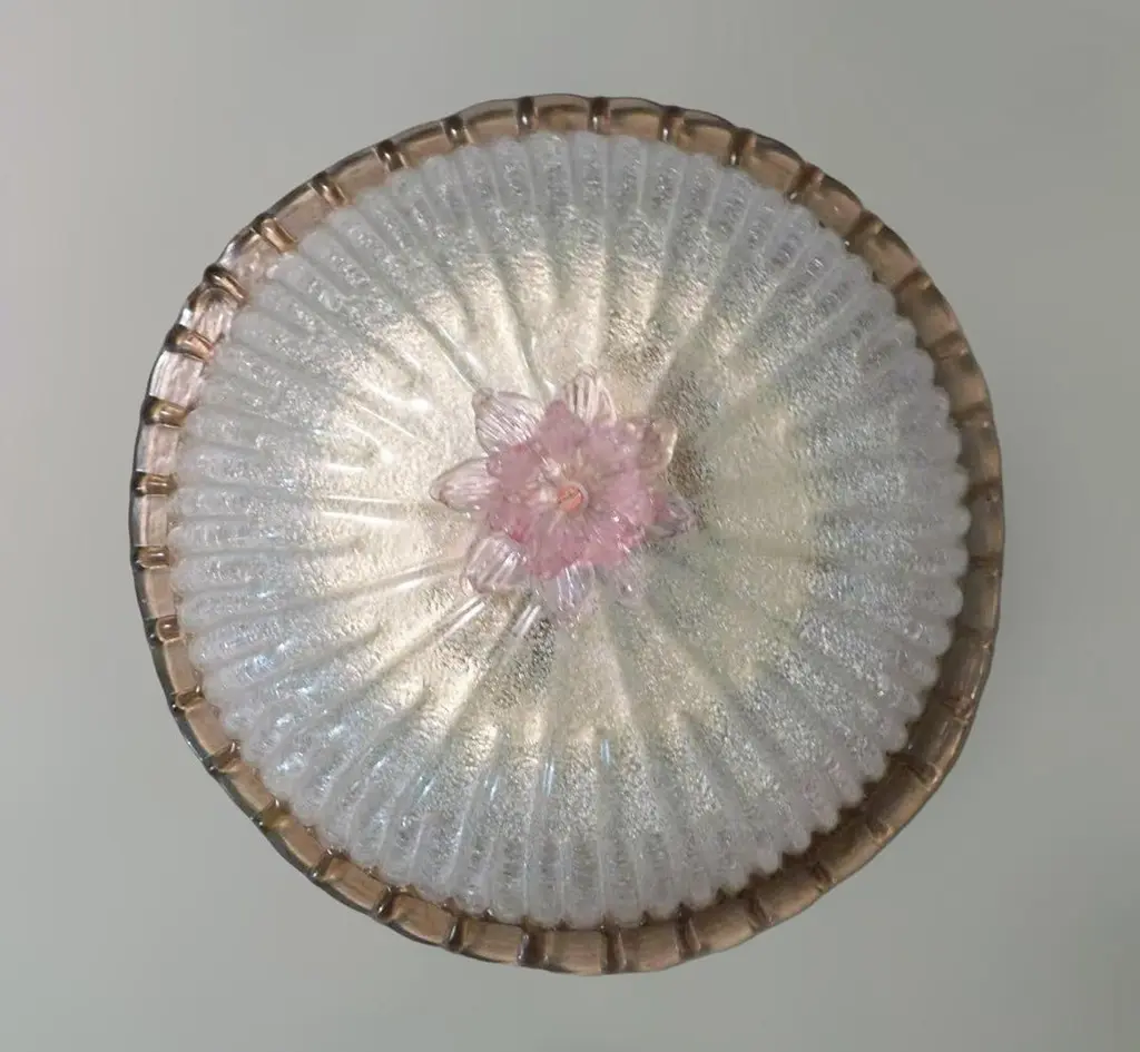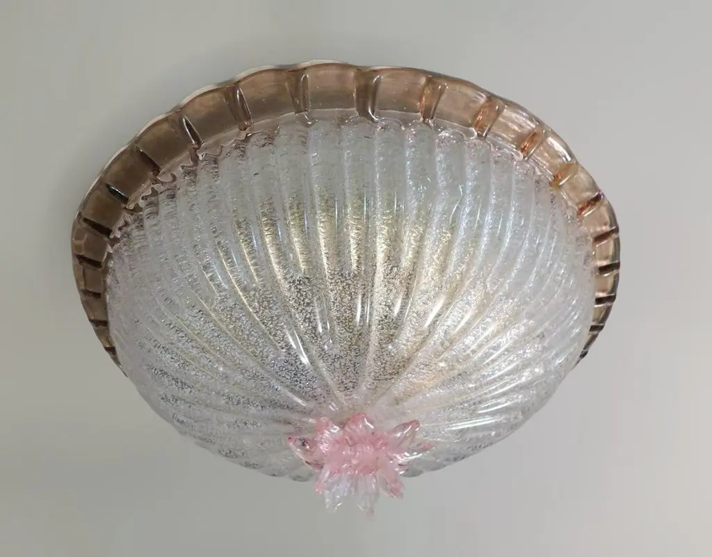 Vintage Italian flush mount with a clear Murano glass diffuser hand blown with granular effect using Graniglia technique, decorated with a brown order and a pink flower in the center / Made in Italy circa 1960s Measures: diameter 13 inches, height 5 inches2 lights / E26 or E27 type / max 60W each3 available in stock in Italy, price listed is for each itemOrder reference #: FABIOLTD K76