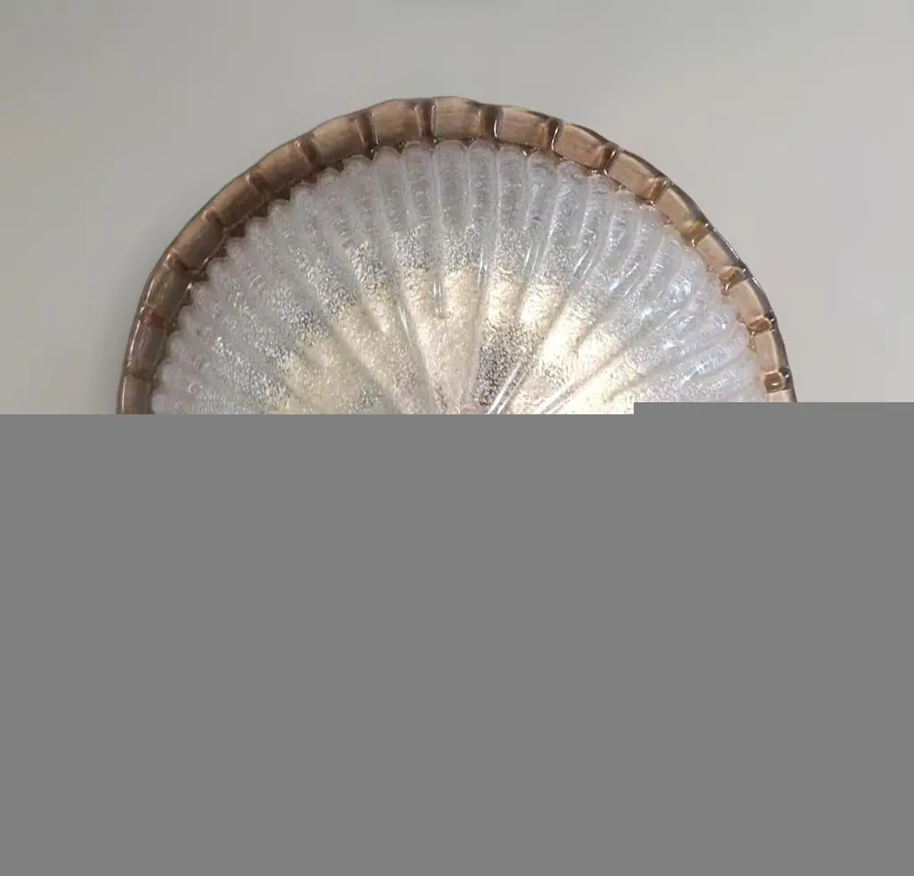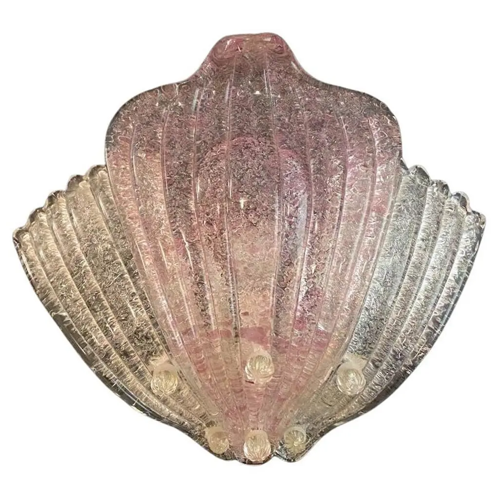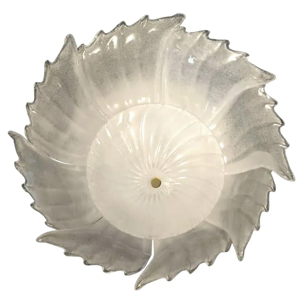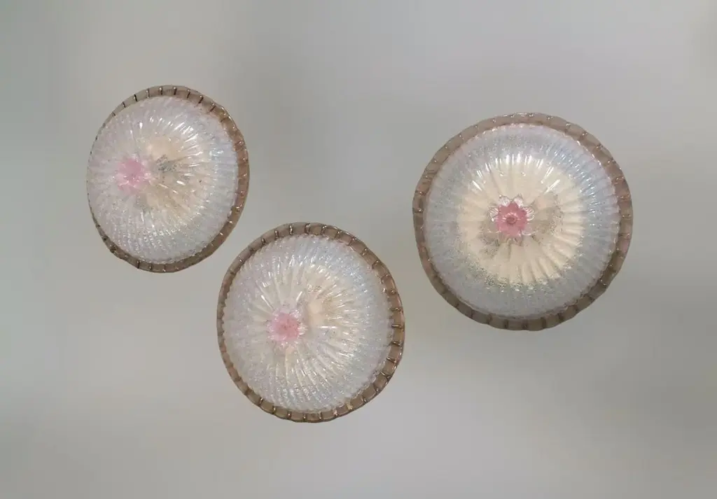 Vintage Italian flush mount with a clear Murano glass diffuser hand blown with granular effect using Graniglia technique, decorated with a brown order and a pink flower in the center / Made in Italy circa 1960s Measures: diameter 13 inches, height 5 inches2 lights / E26 or E27 type / max 60W each3 available in stock in Italy, price listed is for each itemOrder reference #: FABIOLTD K76
