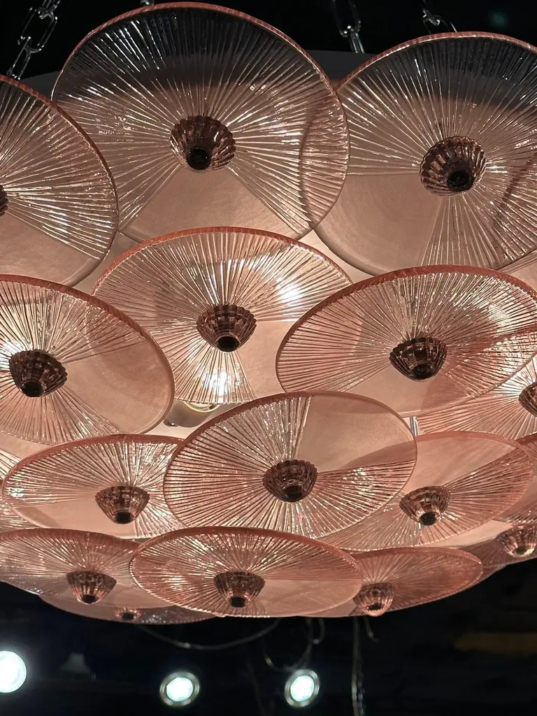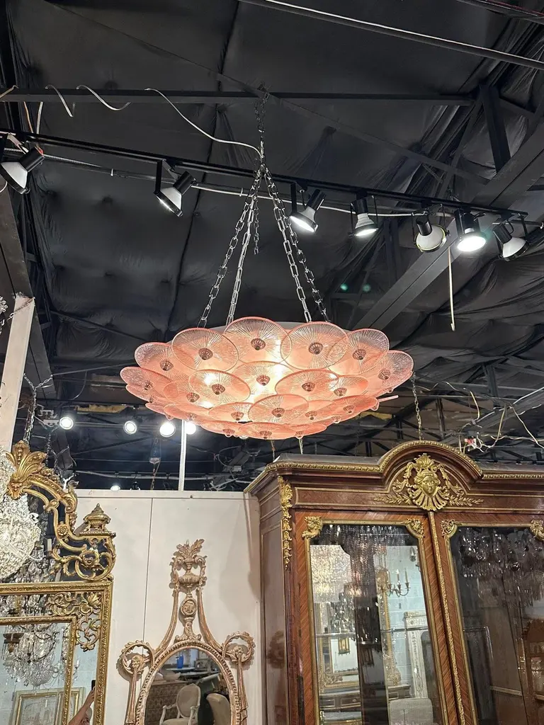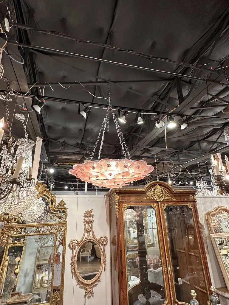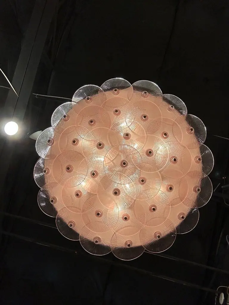 Modern Murano pink disc flush mount chandelier. Circa 2000. The chandelier has been professionally re-wired, cleaned and is ready to hang. Sure to make a statement!