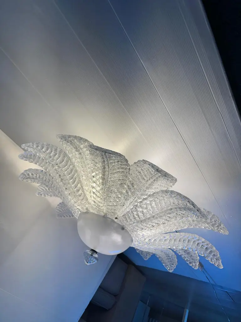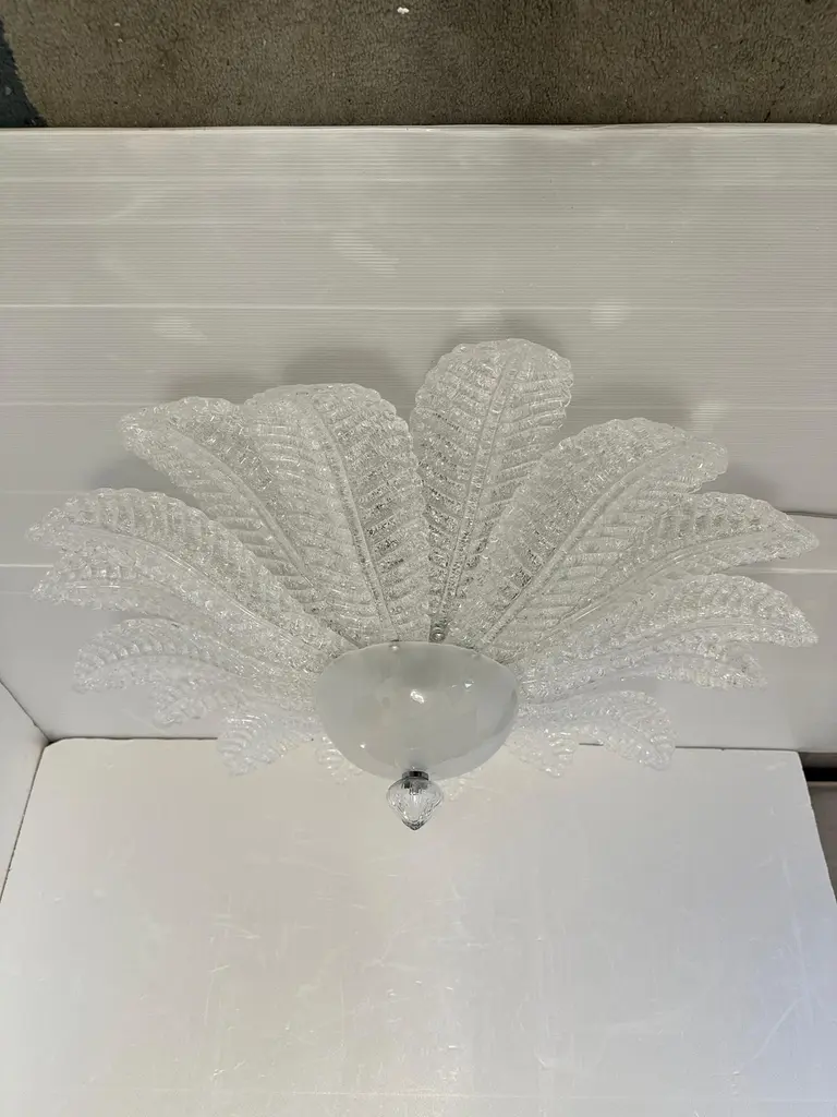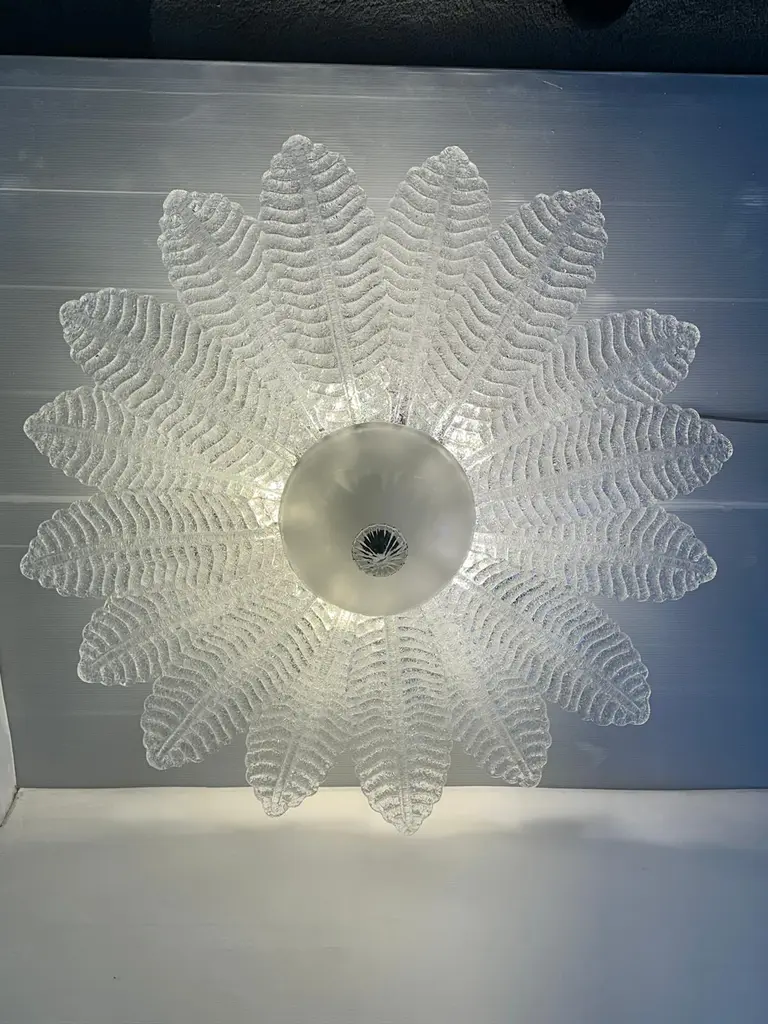 Impressive Murano Glass Sputnik Chandelier flush mount like mazzega zuccheri venini barovier style All leaves are in "graniglia"clear and central cup in clear sand, fruit of hight italian craftmanship. Diameter 80 cm = 31.4" height 30 cm = 11.7" Metal frame chromo 5 lights,bulbs not included Spare parts murano glass included Ship from Italy and the sputnik murano glass is wire for USA