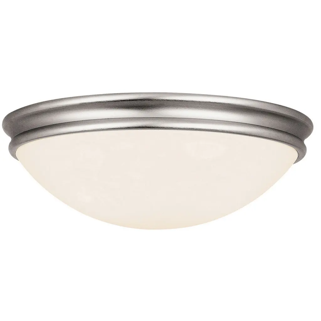The Nash two light flush mount fixture in brushed nickel is an ENERGY STAR½ qualified lighting fixture that uses LED bulbs to save you both time and money. The Nash flush mount ceiling fixtures by provide a clean, subtle look with a designer finish. Offered in Chrome, Brushed Nickel, Satin Bronze, White and Heirloom Bronze finishes, the assortment includes one-light, two-light and three-light flush mounts. Installation and bulb changing is easy with a twist and lock glass shade - no screws or glass holders to lose. Incandescent, Integrated LED, and ENERGY STAR-qualified LED lamping are available. All fixtures are Damp Rated and California Title 24 compliant.