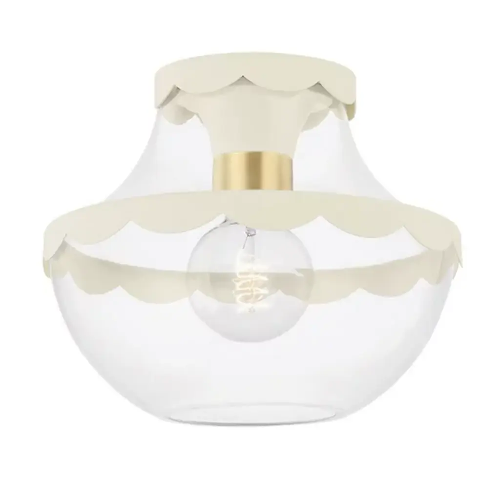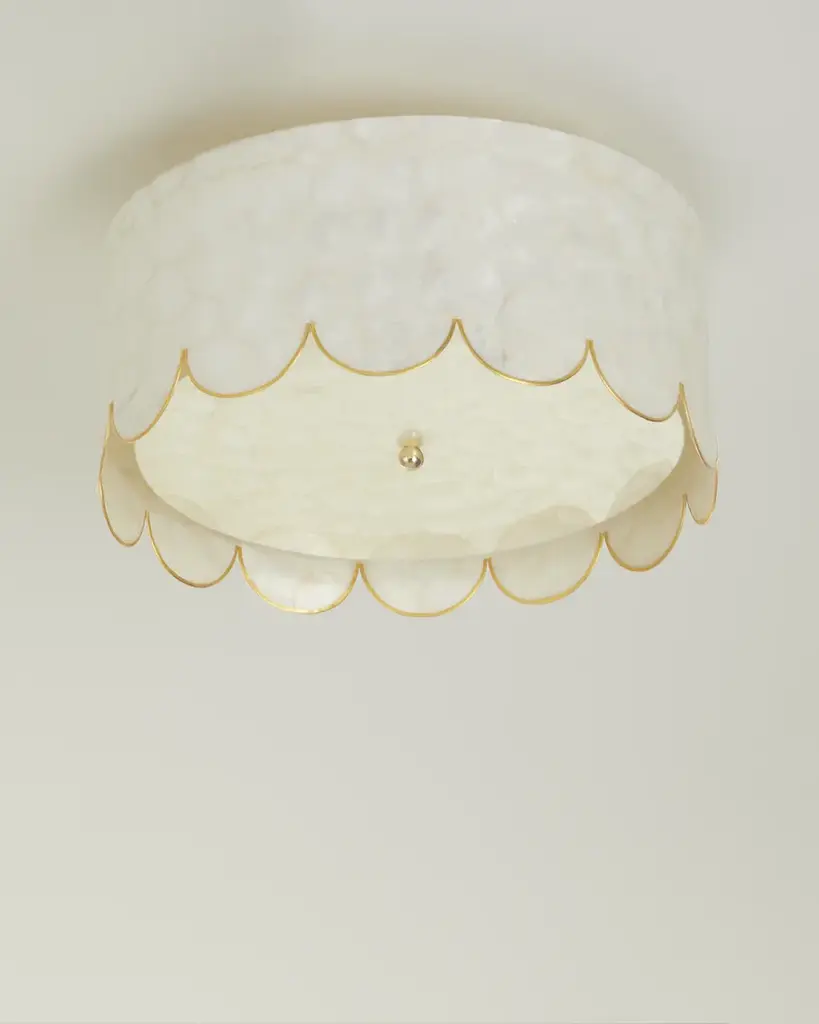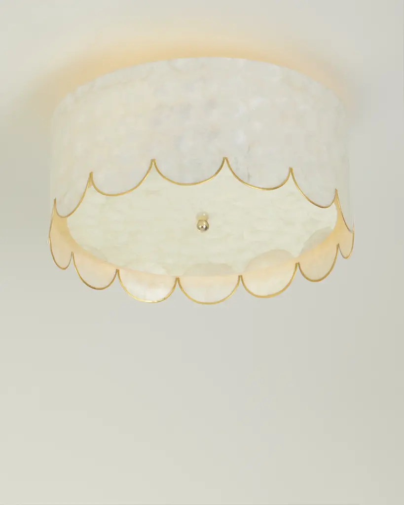 Handcrafted flush mount features hand-cut Capiz shells. Made from brass and iron hardware. Uses two type-A 60-watt bulbs (not included). Approx. 9.5"T x 18"W. Back plate: 4.5"Dia. For indoor use only. UL listed. Imported. Boxed weight, approximately 7 lbs. undefined