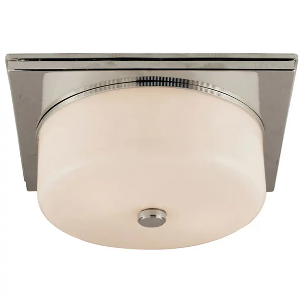 Clean, cylindrical, and contemporary. The Newhouse Circular Flushmount by Visual Comfort Signature, formerly known as Visual Comfort,, designed by Thomas O'Brien, brings no-frill useful illumination to contemporary spaces like entryways, hallways or bedrooms. Its cylindrical diffuser made of glass is set on a square metal ceiling mount to create a unique juxtaposition of contrasting shapes. This diffuser is equipped to hold 2 incandescent light bulbs that create a pleasing pool of direct downlighting.