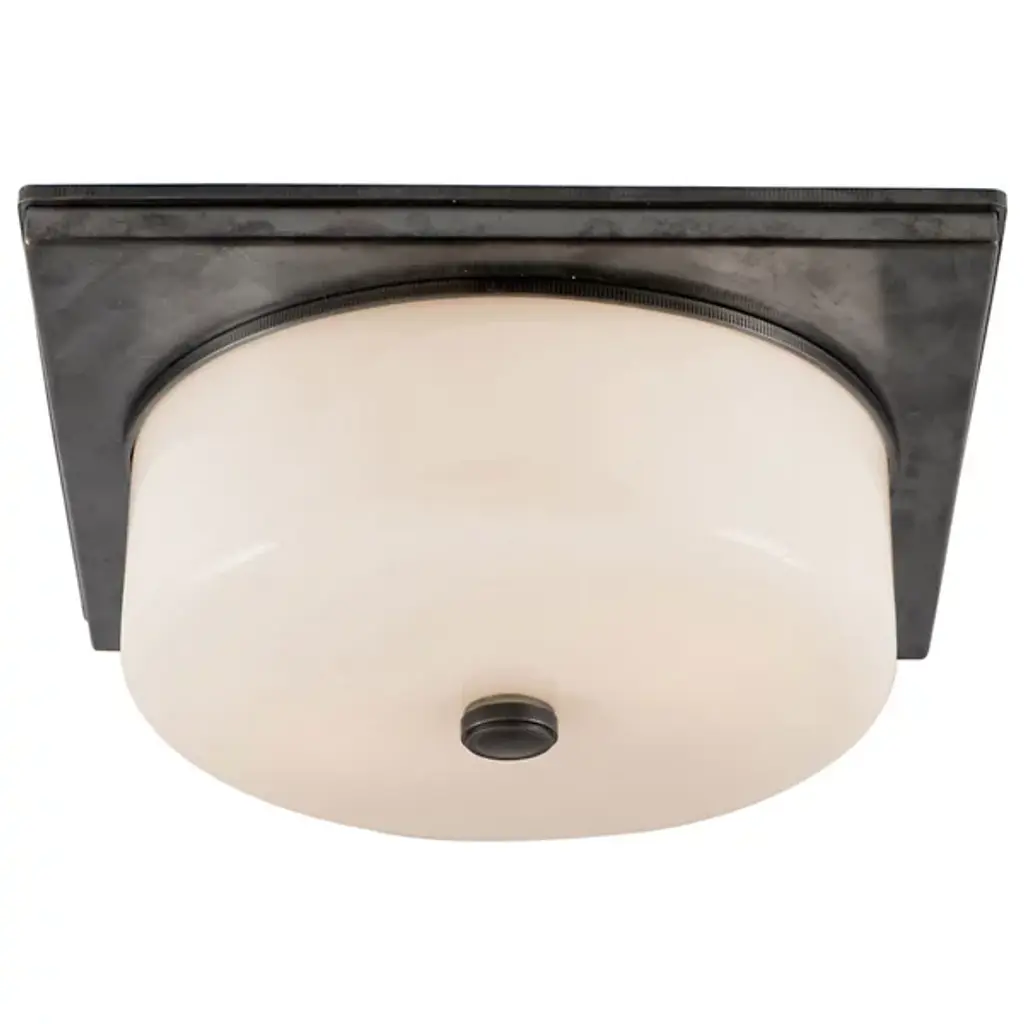 Clean, cylindrical, and contemporary. The Newhouse Circular Flushmount by Visual Comfort Signature, formerly known as Visual Comfort,, designed by Thomas O'Brien, brings no-frill useful illumination to contemporary spaces like entryways, hallways or bedrooms. Its cylindrical diffuser made of glass is set on a square metal ceiling mount to create a unique juxtaposition of contrasting shapes. This diffuser is equipped to hold 2 incandescent light bulbs that create a pleasing pool of direct downlighting.