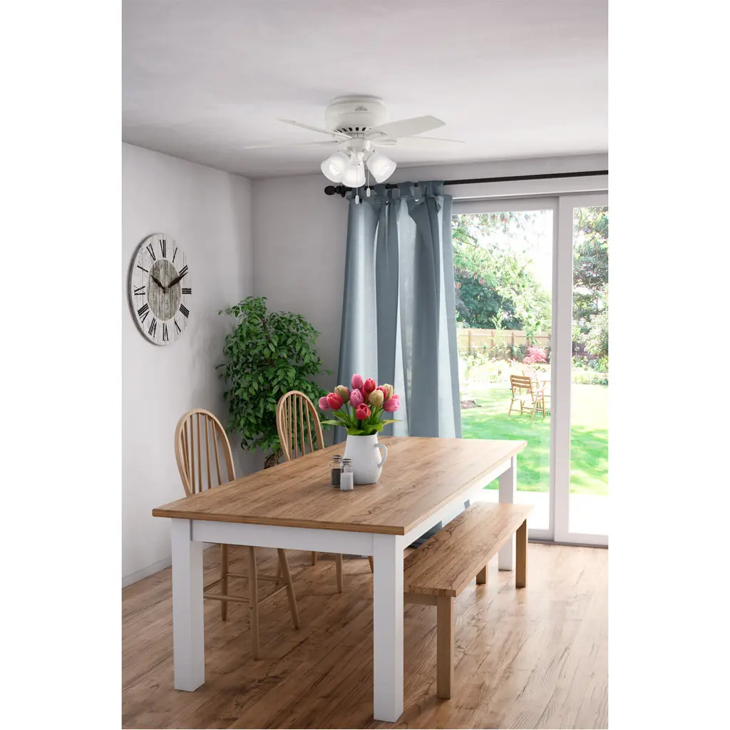 With its charming appearance, the Newsome traditional flush mount ceiling fan will complement a home's casual design style. The clean line details throughout the fan body and blade irons work together to create a coherent design that will fit any small room with a low ceiling. The three-light fixture provides the ideal ambiance while the 42-inch blades are powered by a three-speed WhisperWind® motor delivering superior air movement and whisper-quiet performance for cooling power without the noise. The Newsome Collection offers the freedom to choose from many different sizes, light kits, and other options to maintain a consistent look throughout every room in the home.