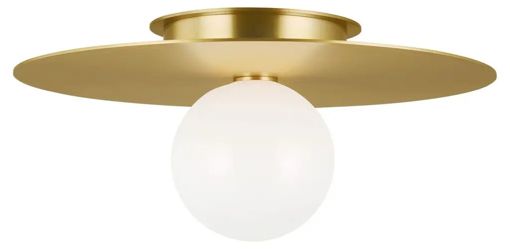 This flush-mount ceiling fixture complementsthe gleaming brass finish of the canopy with a diffuser of opalescent mouth-blown milk glass that gives the light a warm, flattering glow.
