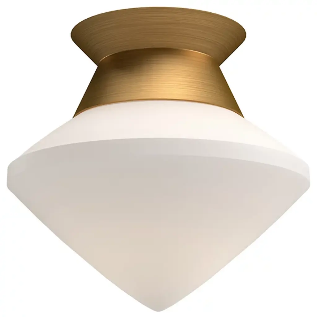 The Nora Flushmount from Alora Mood guides one’s eyes with an arrow-like silhouette and a beacon of comfortable lighting. This flushmount’s attractive, sculptural shapes reference those of mid-century modern design. It also carries the beautiful contrasting colors of the mid-mod style through its steel canopy and glass shade. The pointy shade fully surrounds the lamping to block out any bright glare. A golden hue displays on the shade as the piece generates a filling, atmospheric glow.