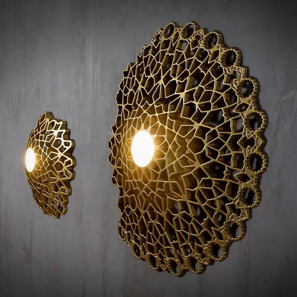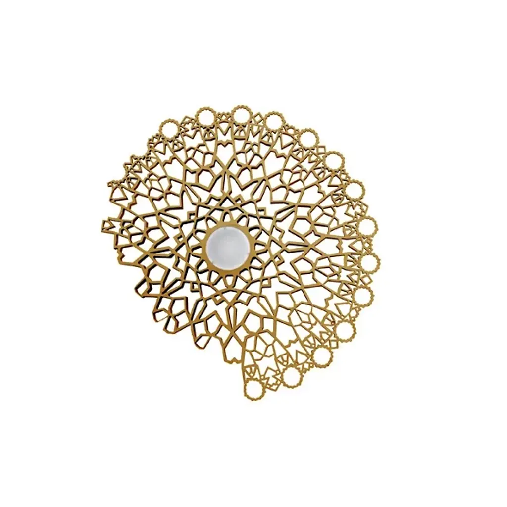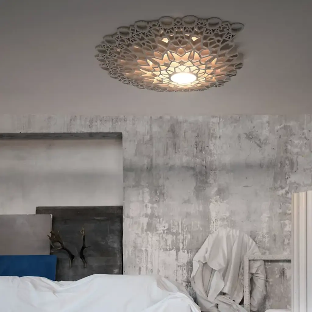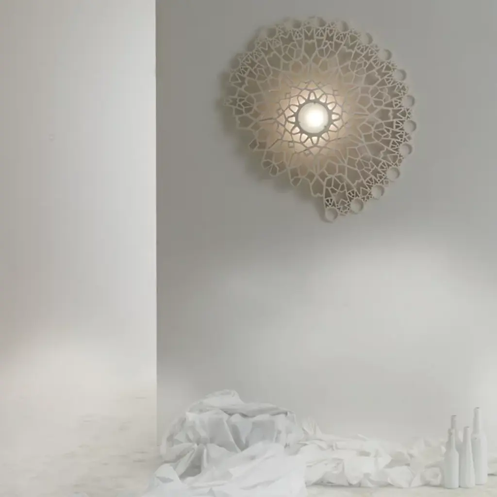 The Notredame LED Wall / Flushmount by Karman finds its inspiration in the beautiful atmosphere created as light filters through rose windows in a Gothic cathedral. Designed by Luca de Bona and Dario De Meo, who met while on the road between Milan and the Italian Veneto region, this piece captures a mix of architecture, light, and design elements found in their travels. Allowing the past and present to coexist, the artful, poetic structure of this design is highlighted with an elegant finish, creating a lovely landscape for light to play within the full and empty spaces of its three-dimensional structure.