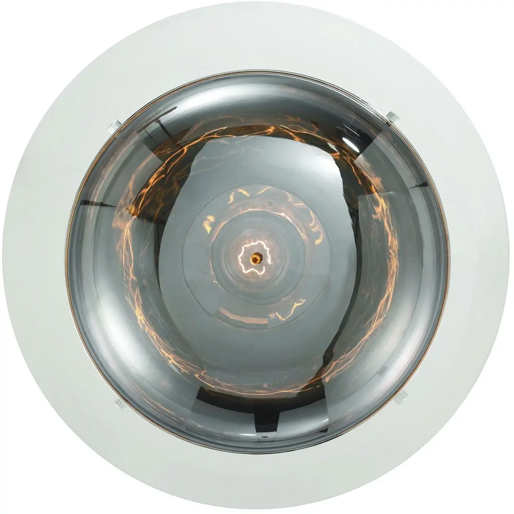 A band encircles each glass orb that beautifully reflects a warm glow from the vintage lights within. The metal support creates an inviting counterpoint to the austere design