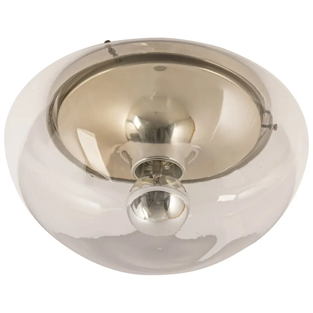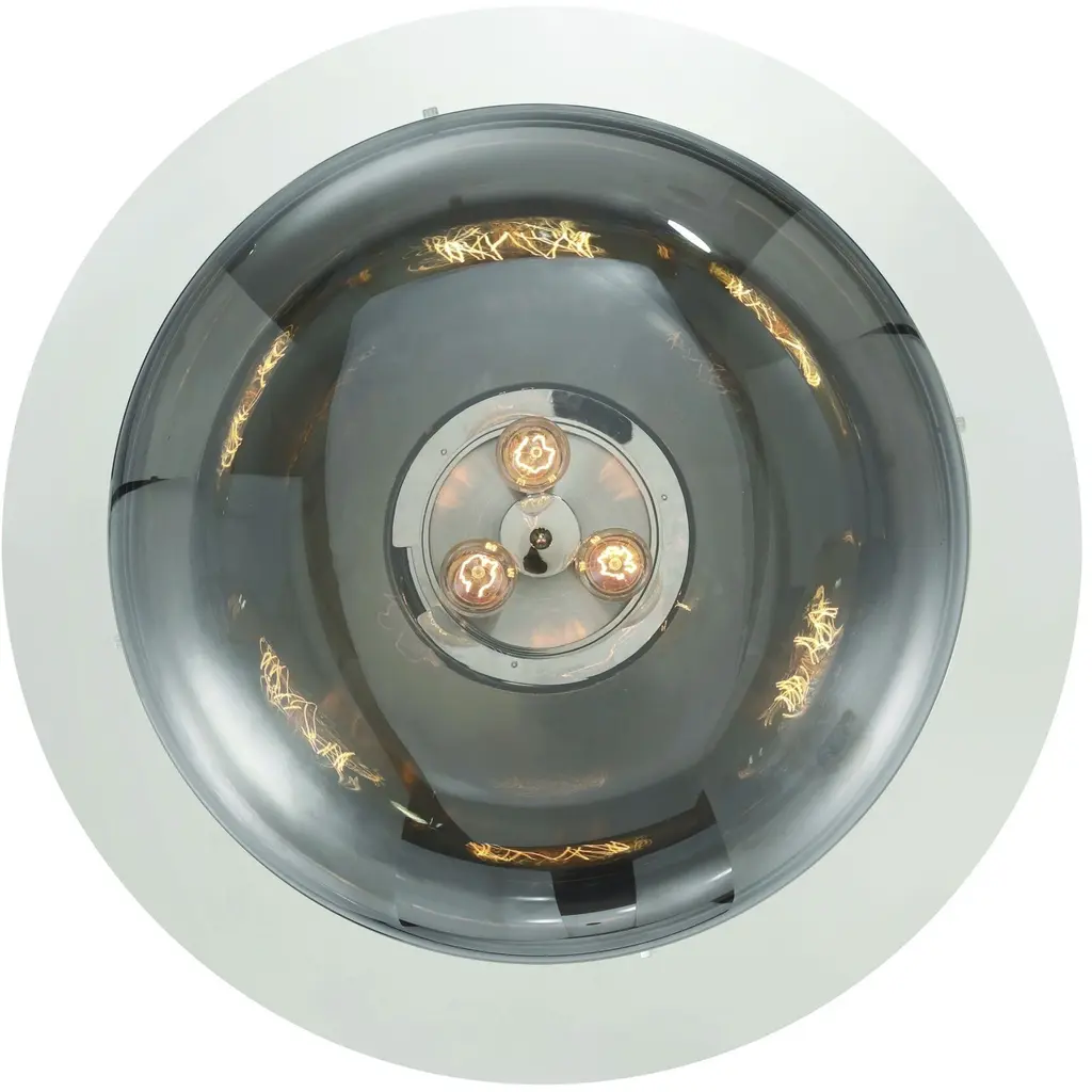 A band encircles each glass orb that beautifully reflects a warm glow from the vintage lights within. The metal support creates an inviting counterpoint to the austere design