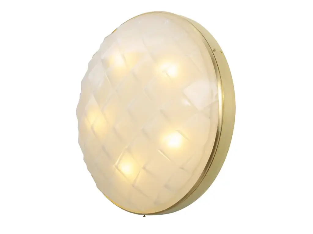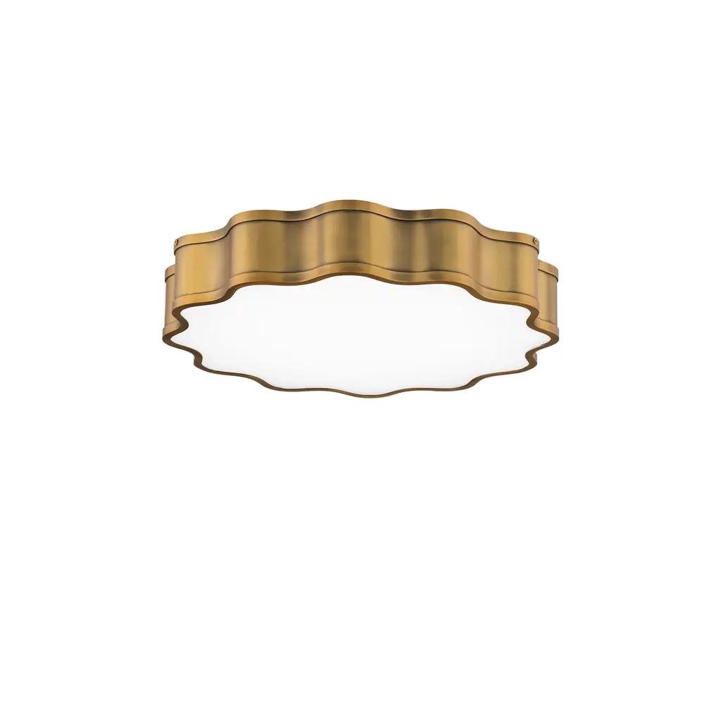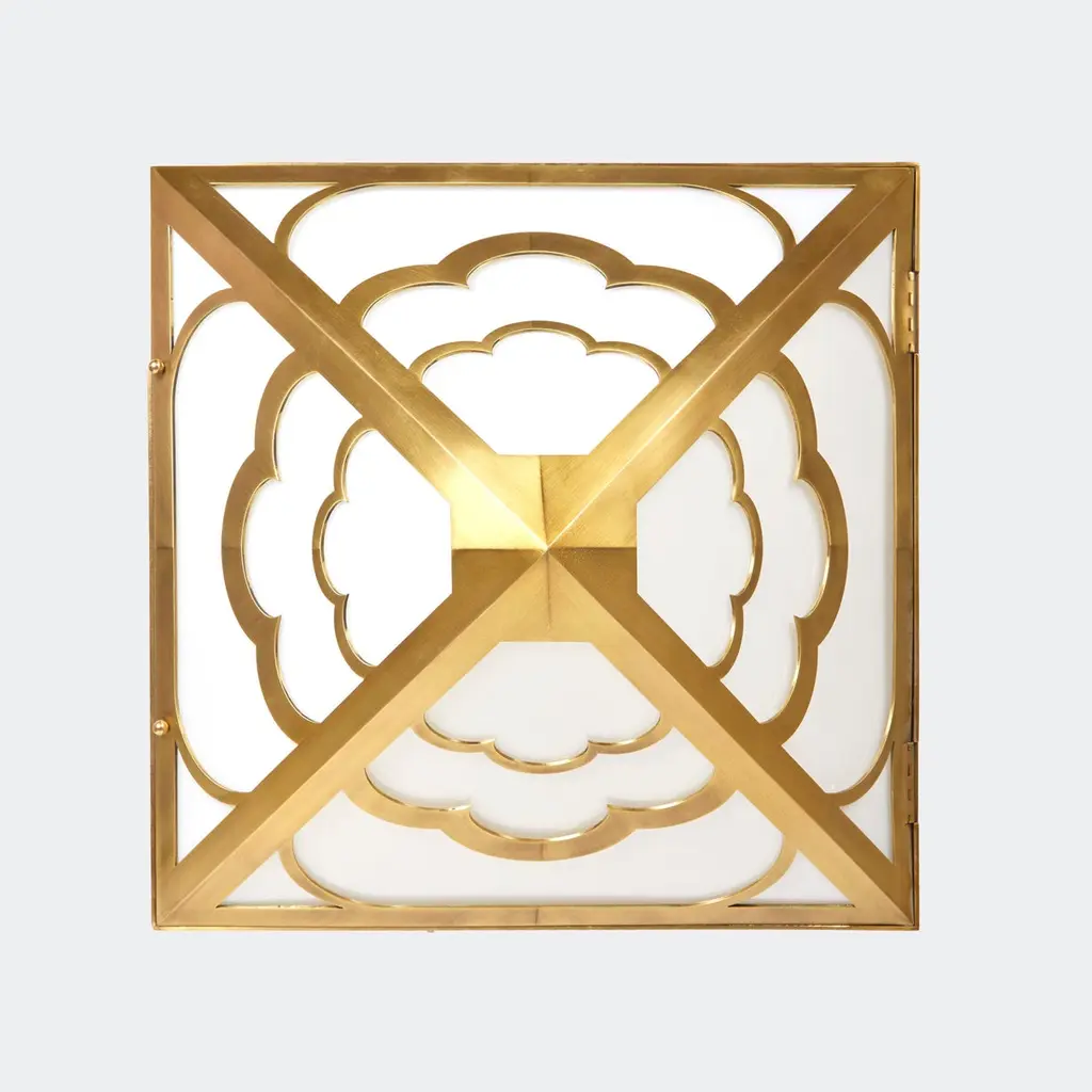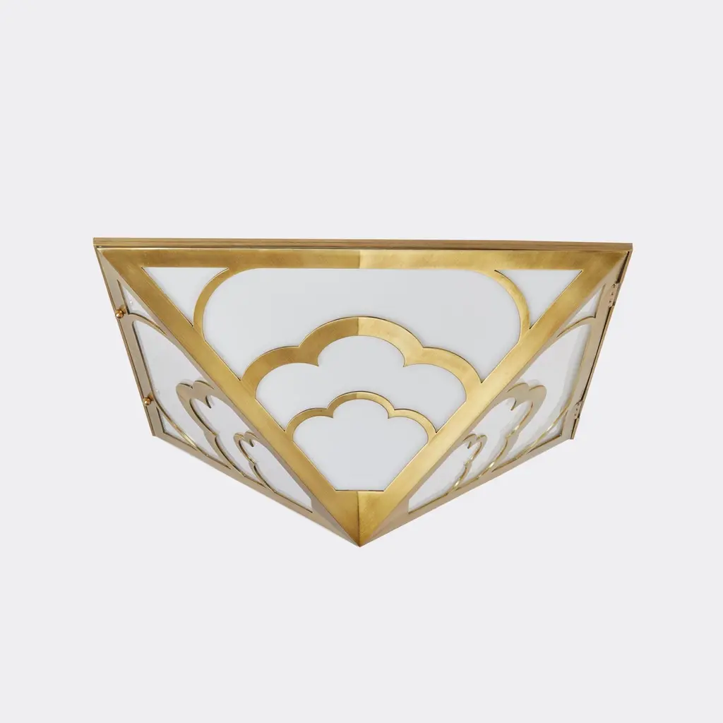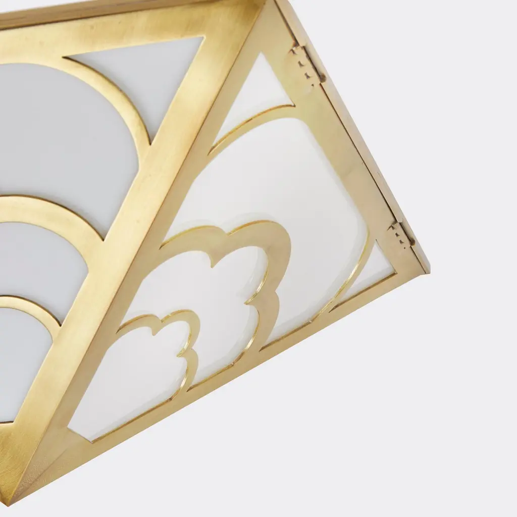 The Nuages Deco Flush Mount, a customizable fixture designed by David Duncan. This inverted pyramid shaped Art Deco style ceiling light features the frame with scalloped arches securing hand blown opalescent glass. A lacquered brass frame, stem and funnel shaped canopy are accented with a hammered texture. This flush mount includes four Edison medium base sockets, with a 400 maximum wattage. Founded in 1989, David Duncan is a trusted design resource for custom and ready-made luxury lighting. Our bespoke program offers myriad fabrication and finish possibilities. Produced in the New York area, our designs blend cutting edge technology with traditional, handcrafted artisan techniques. David Duncan offers a dynamic assortment of pieces for today’s luxury interiors, and can accommodate custom projects of any scale.