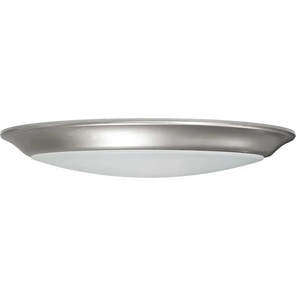 Material: Steel, Finish Color: Brushed Nickel, Width: 9.49", Height: 1.28", Hanging Method: Flush, Lamping Type: LED, Wattage: 16 Watts, Cri: 90, Color Temperature: 5000 Kelvin, Lumens: 1230, Dimmable: Yes, Moisture Rating: Wet Rated, Desc: Satco's new LED Disk Light fixtures are the perfect choice for adding cost effective, energy-efficient lighting to a variety of areas in your home. Sku #62-1671 features a 10 inch diameter, 5000K CCT in a traditional white finish. Available in a convenient 6 pack, this unit will save your contractor valuable time in installation. NEC compliant and wet location rated, the Satco LED Disk Light fixtures are truly an all-purpose lighting solution. Closet Rated - NEC 410.16(A)(3) and NEC 410.16(C)(5) Mounts to 3 in. and 4 in. Junction Boxes Wet Location Rated Rated for 50,000 Hours 5 Year Warranty Operating temperature ranging from a minimum of -35C (-31F) to a maximum of 50C (122F).,