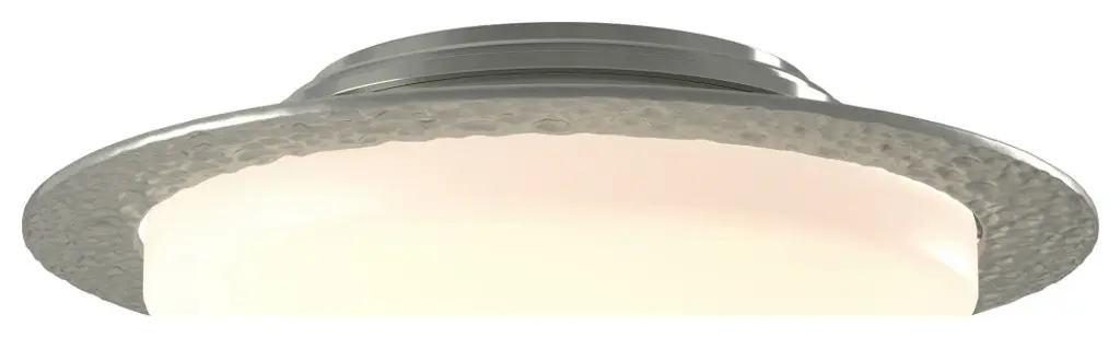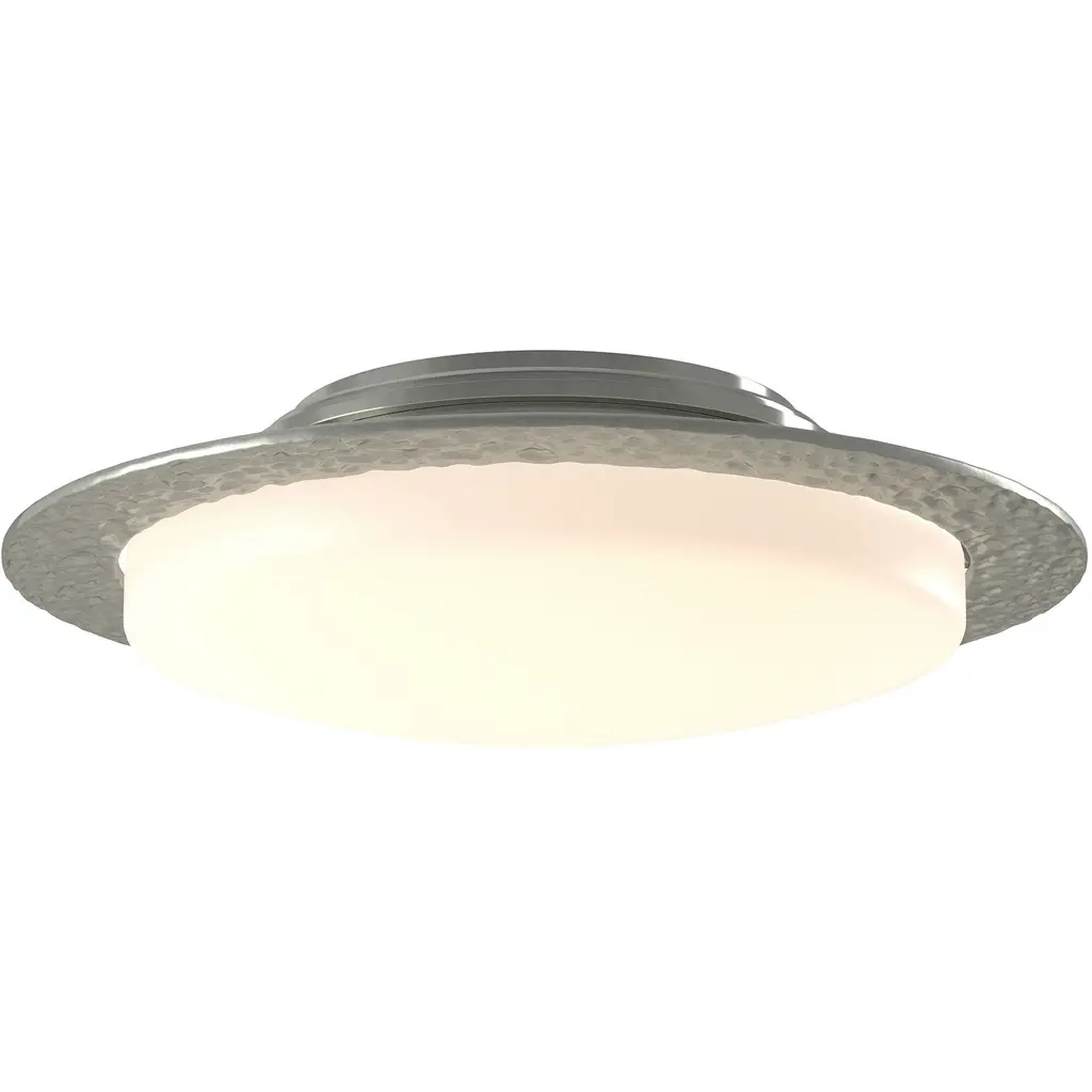 Simple, clean, and elegant are all words that encompass the Oceanus Flushmount from Hubbardton Forge. Overall, the piece uses rounded edges and a circular construction to create a gentle seamless piece. A textured metal strip wraps around the lampshade, giving the piece a sleek futuristic aesthetic. The dome-shaped construction of the glass lamp shade creates diffused ambient lighting as well glowing circular light reflected on the ceiling. This piece works well providing soft lighting in intimate rooms such as living rooms and bedrooms.