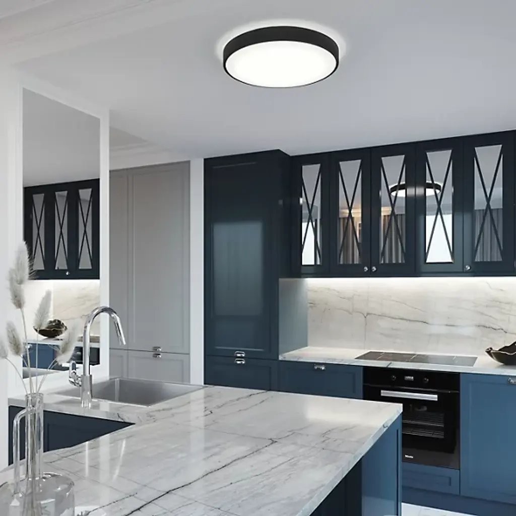 A sleek and smart lighting choice for sophisticated interiors. The Octavia LED Flush Mount by AFX plays it smooth with its frame: a ring of Steel that holds a disc of White Acrylic. The lens both hides the integrated LEDs and diffuses a broad and bright wash of light downward. The metal housing hangs just below the ceiling, allowing a halo of light around the fixture. The different layers of ambience bring depth and dimension to wherever this flush mount is installed. Use it to enhance the style of spaces with ceilings high or low, including living rooms, kitchens and bedrooms.